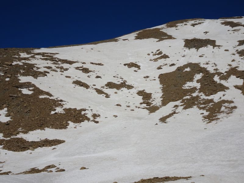 Pas de regel sauf sur les vieux névés. La surface est cabossée de reliefs très variés mais connait surtout une fusion accélérée avec beaucoup d'eau sous la couche. Durée de vie très courte à ce rythme. Dans le raide sous le sommet la couche superficielle coule sous les skis mais lentement.
