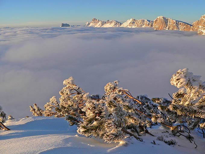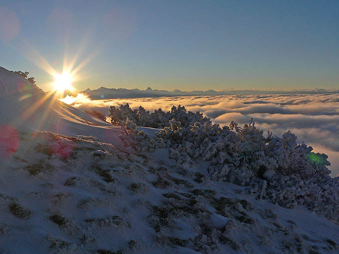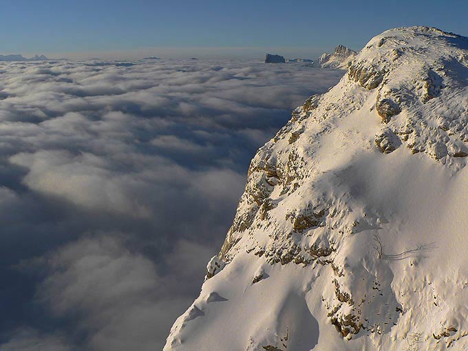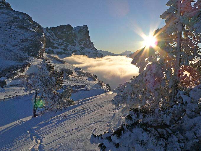 Réveillé en pleine nuit et dans l'impossibilité de me réendormir (c'est ça être père de famille), je modifie le programme de la journée en allant chercher le lever de soleil au pas de la Balme. Une fois de plus, rien ne peut me faire regretter ce type de choix, pas même le plus beau des couloirs poudreux. Pas vu un chat.