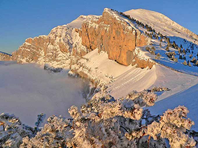 Montée par la piste de ski la plus au sud (qui maintenant n'en est plus une, déjà colonisée par des arbustes d'ailleurs), pas de la Balme, Chaudières, pente ouest puis combe de Fer jusqu'à 1500 m. remise des peaux pour revenir par la piste de montée. Ski à 3 minutes de la bagnole.