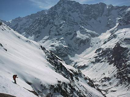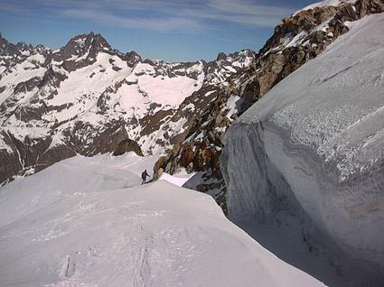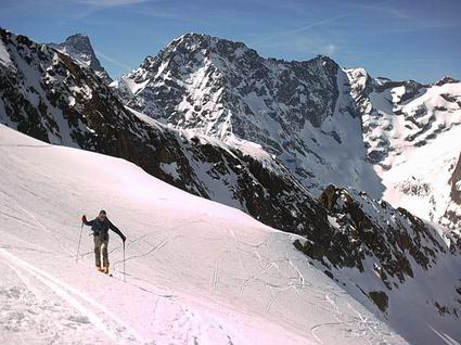 Sauf un dechaussage de 100m avant l'oratoire, on a pu skie integralement jusqu'au Veneon mais ca ne va pas durer. Ce n'est d'ailleurs deja plus possible si on passe par la Lavey. La toute derniËre pente est en bonne conditions, avec un petit saut de rimaye qui s'evite a la montee en passant par l'arete