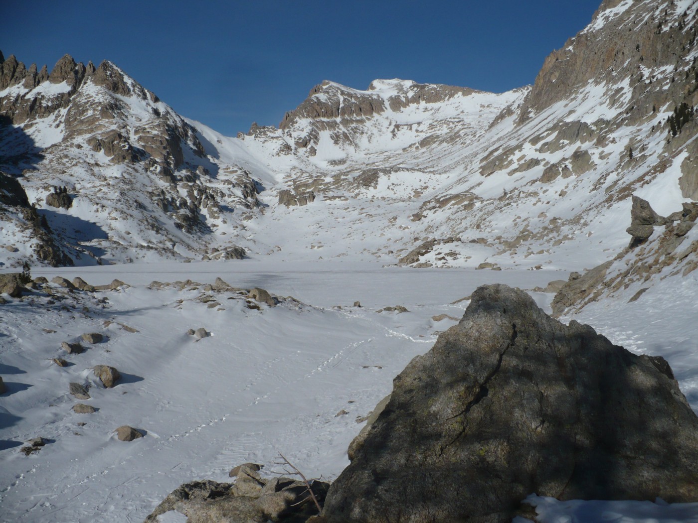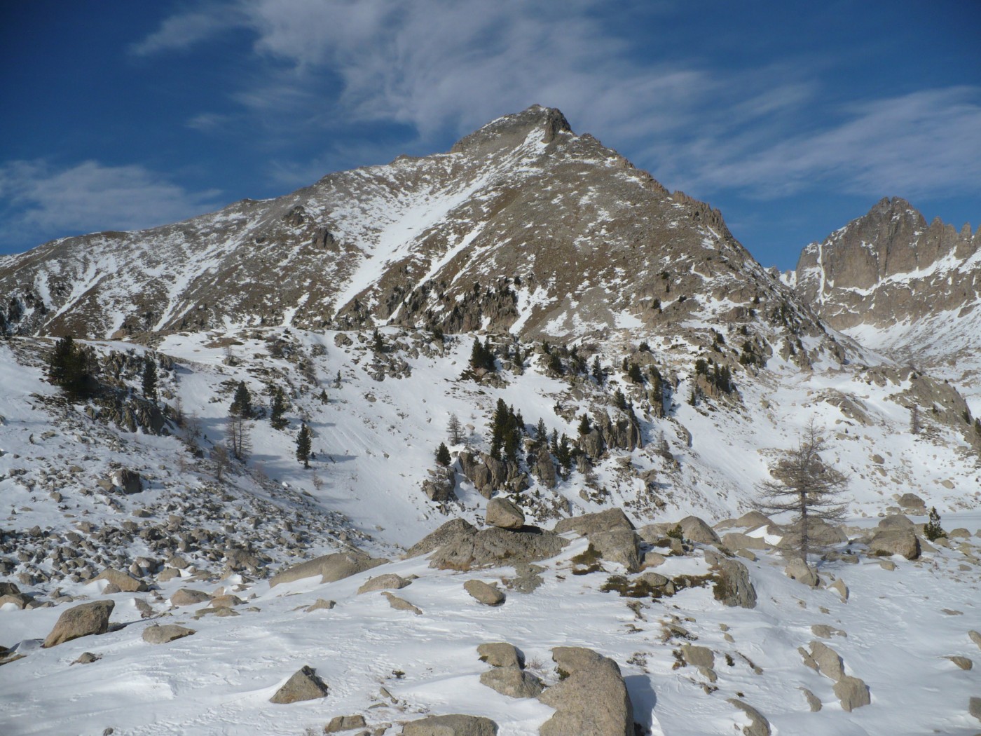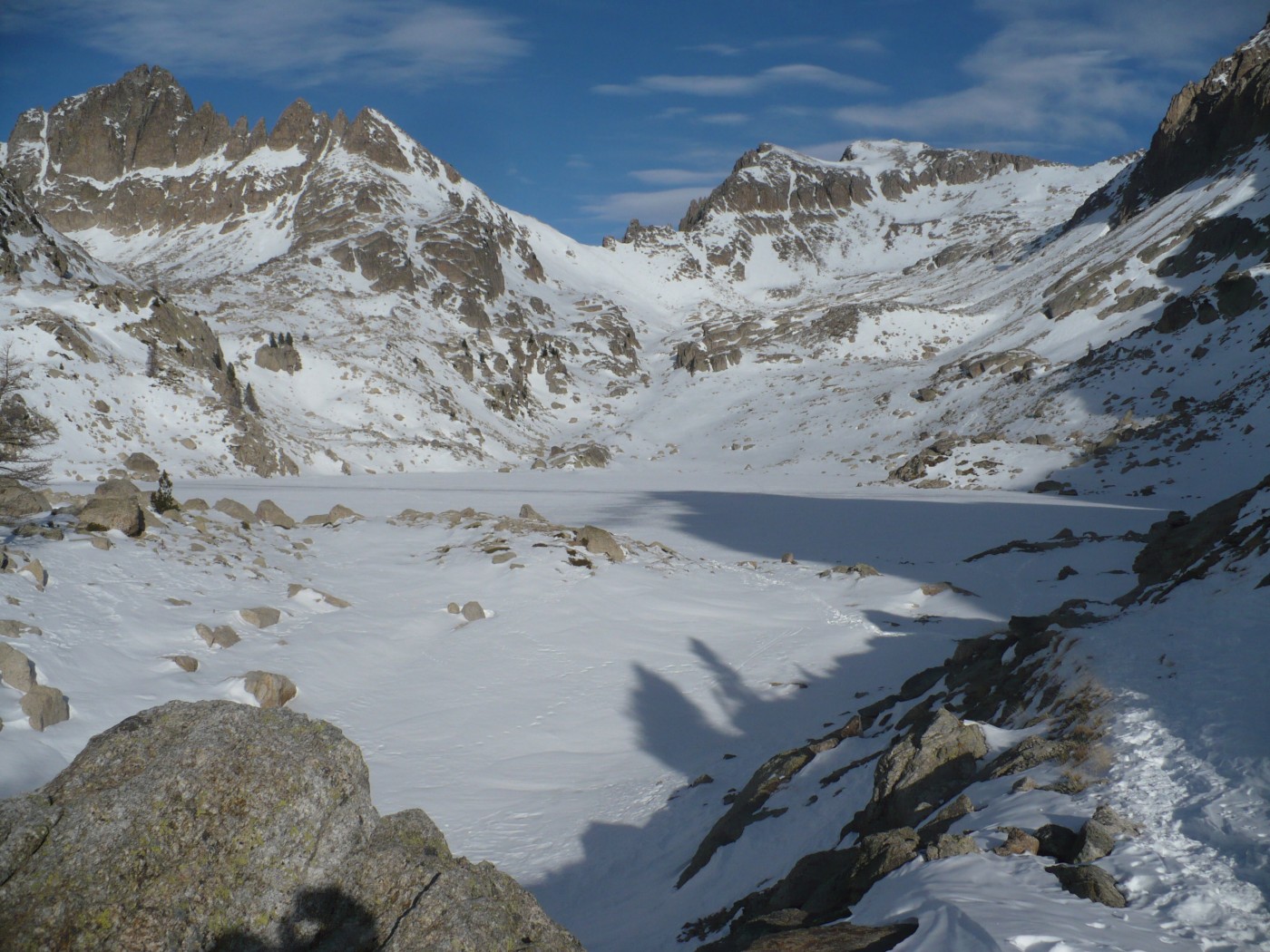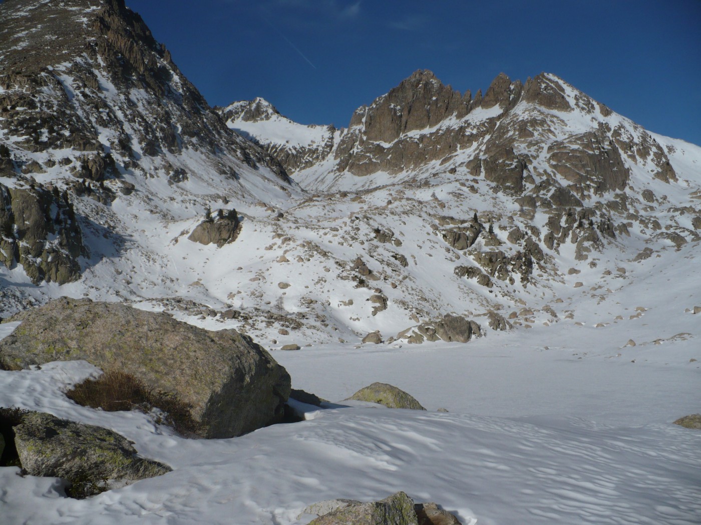 Du col (2031m) redescendre sur une centaine de mètres en distance versant NW puis remonter plein Nord vers le lac Nègre, si l’enneigement est suffisant (pas le cas aujourd’hui), ou monter N/E jusqu’au point 2272 m (le cas aujourd’hui), et contourner le Caïre Pounchu par le flanc ouest jusqu’au lac Nègre.