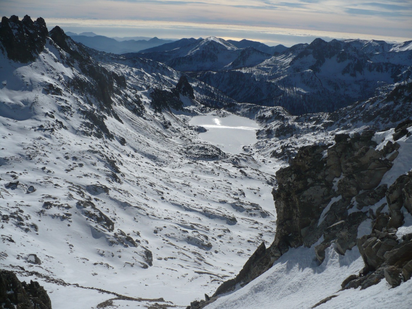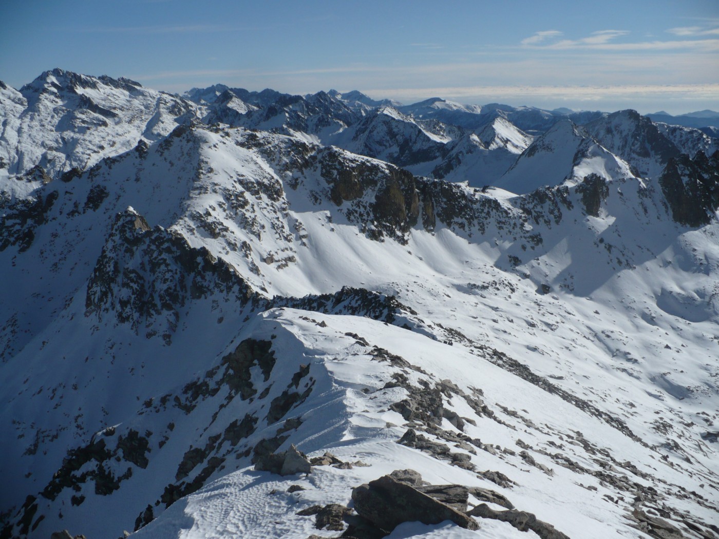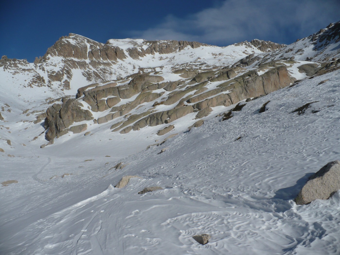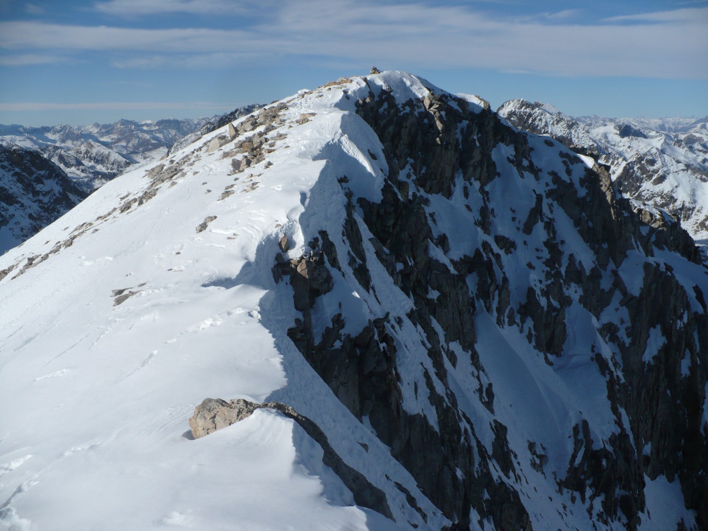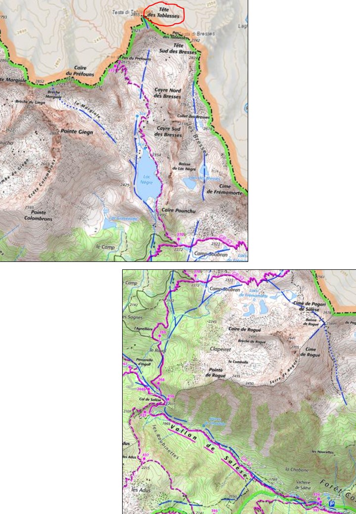 Du col (2031m) redescendre sur une centaine de mètres en distance versant NW puis remonter plein Nord vers le lac Nègre, si l’enneigement est suffisant (pas le cas aujourd’hui), ou monter N/E jusqu’au point 2272 m (le cas aujourd’hui), et contourner le Caïre Pounchu par le flanc ouest jusqu’au lac Nègre.