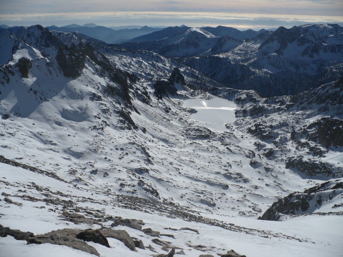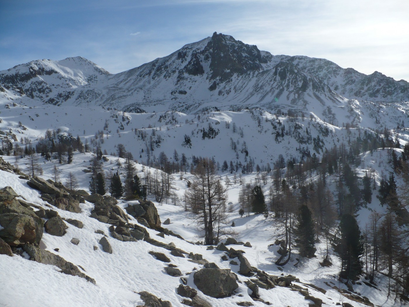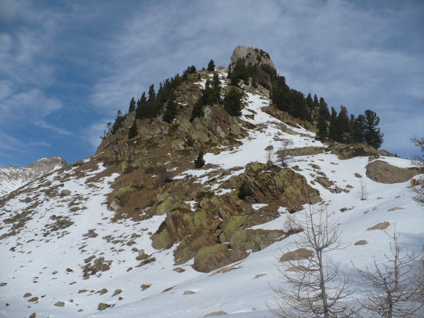 Quand on aime, on ne compte pas, retour au parking avec cette fois-ci, -5°C au départ. La montée au col de Salèse est toujours agréable au milieu des mélèzes en prenant le sentier comme raccourci. La forêt clairsemée m’a fait oublier cette neige croutée. La rive gauche du lac se skie facilement en choisissant les meilleurs passages. Montée dans la combe au milieu des dalles de granit. Le couloir est large avec un ressaut à la sortie. Final en louvoyant entre les pierres. Au sommet, vue à 360°.