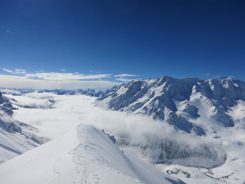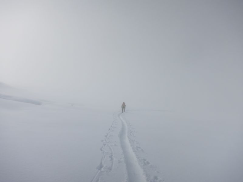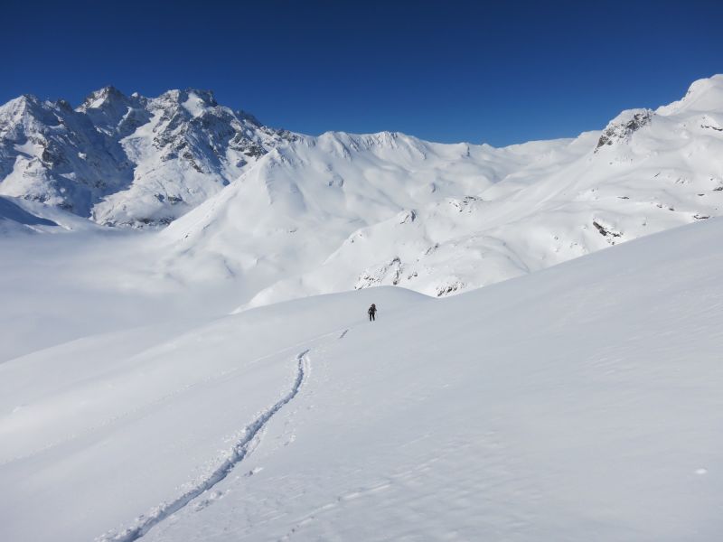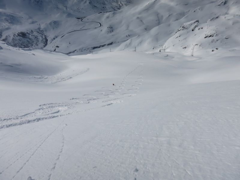 Nous avons visé et remonté à skis une pseudo arête qui sépare les pentes sud/est et sud/ouest, l'arête part du sommet jusqu' au point 2524m, dilemme skier les pentes chaudes ou les pentes froides , un moyen pour le savoir remonter cette arête, nous avons skié en sud ouest,(merci aux traceurs de la partie inférieure sous l'arête)