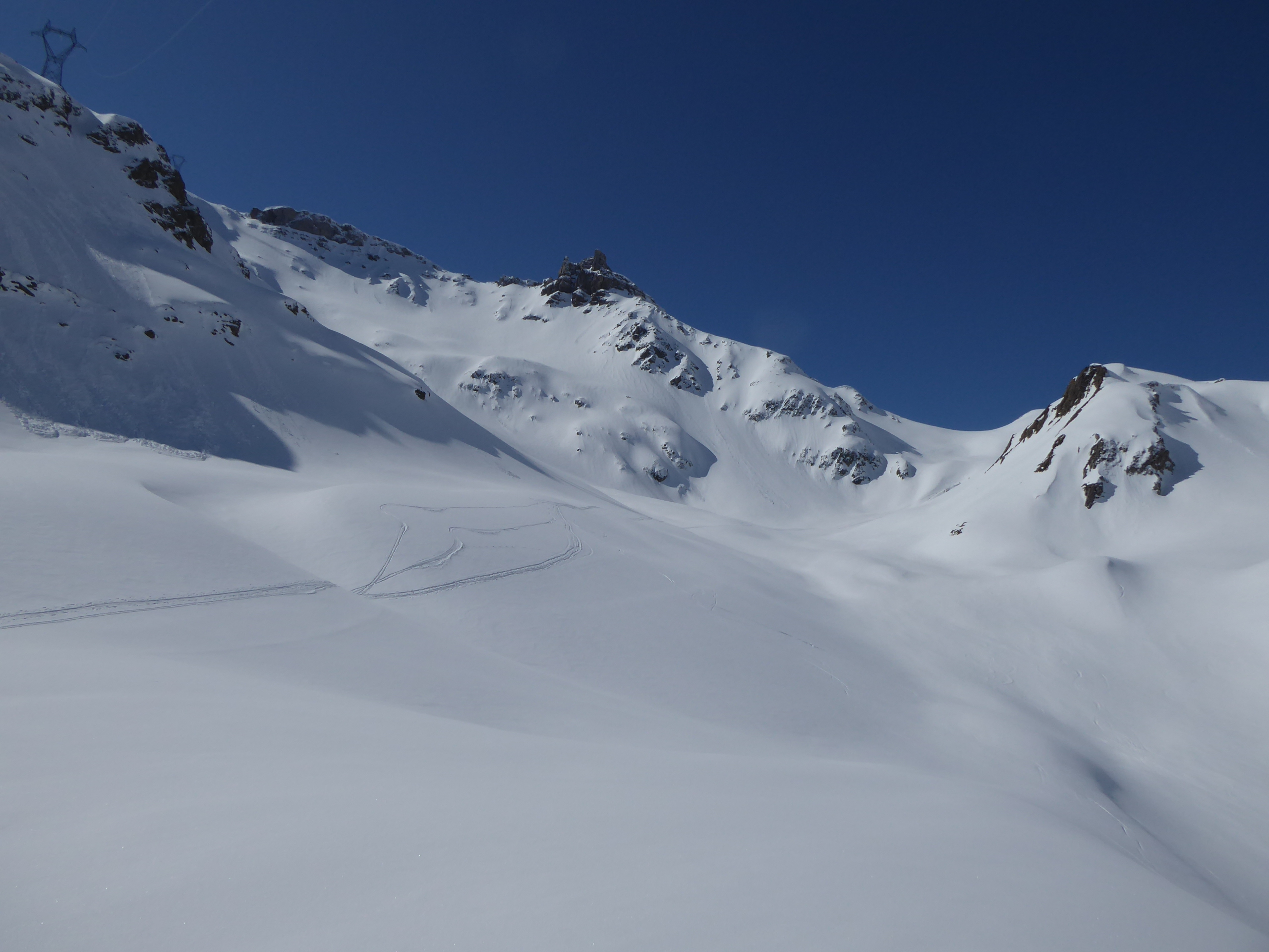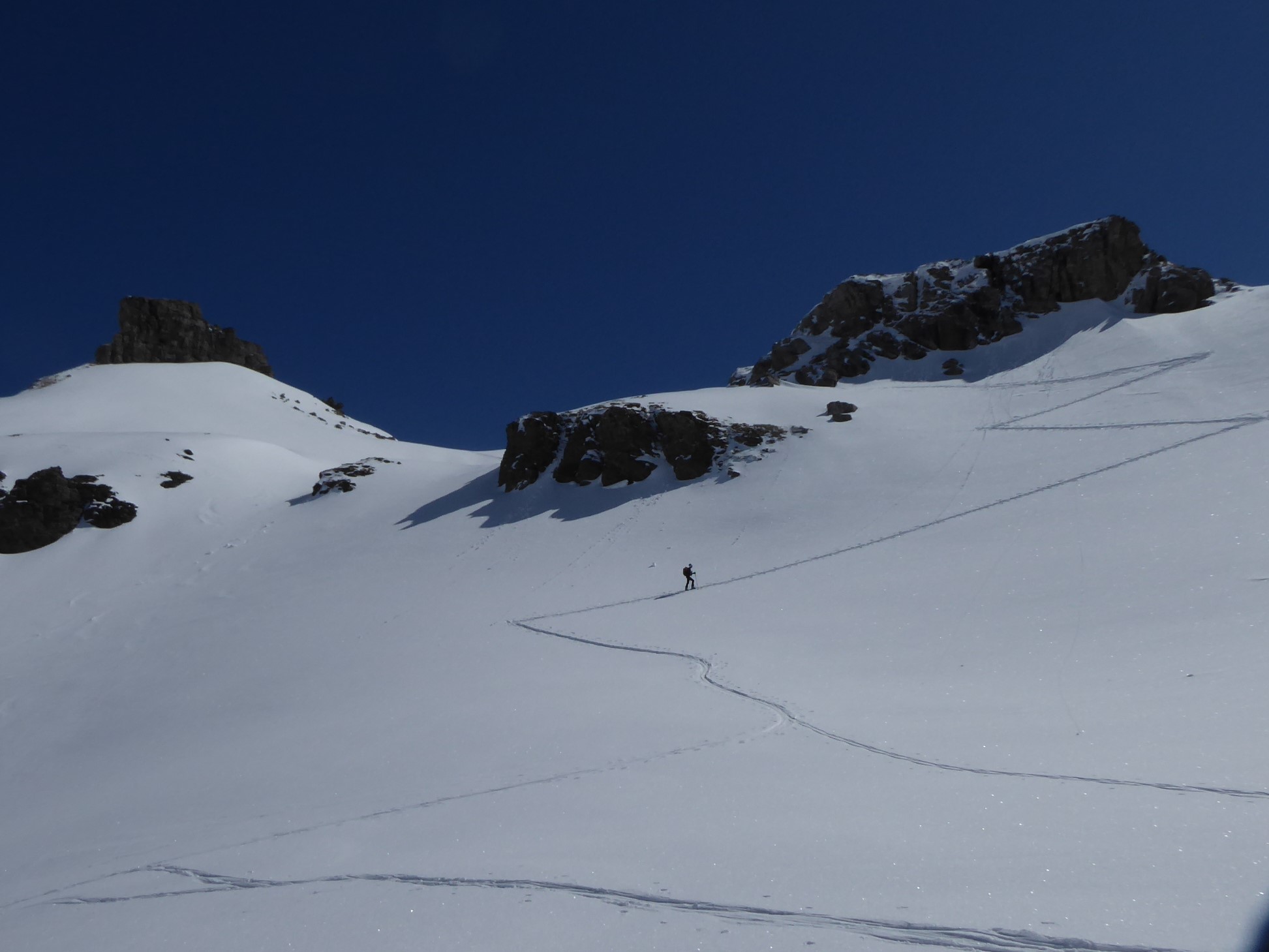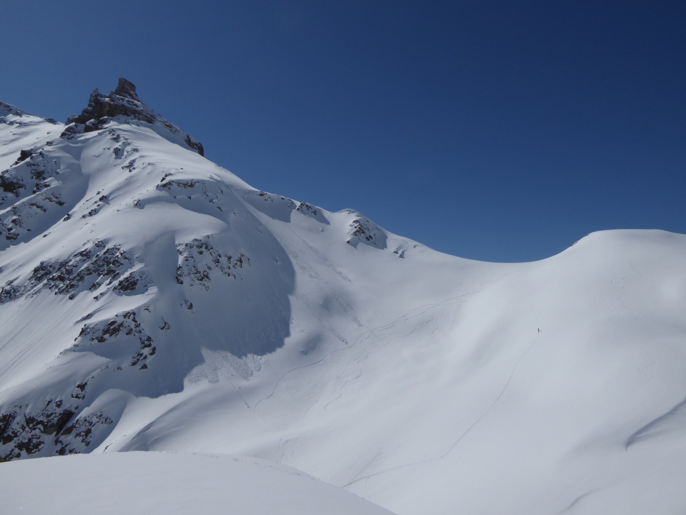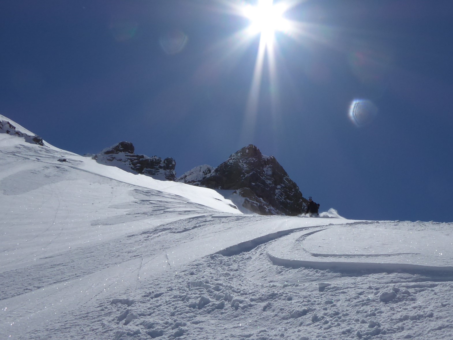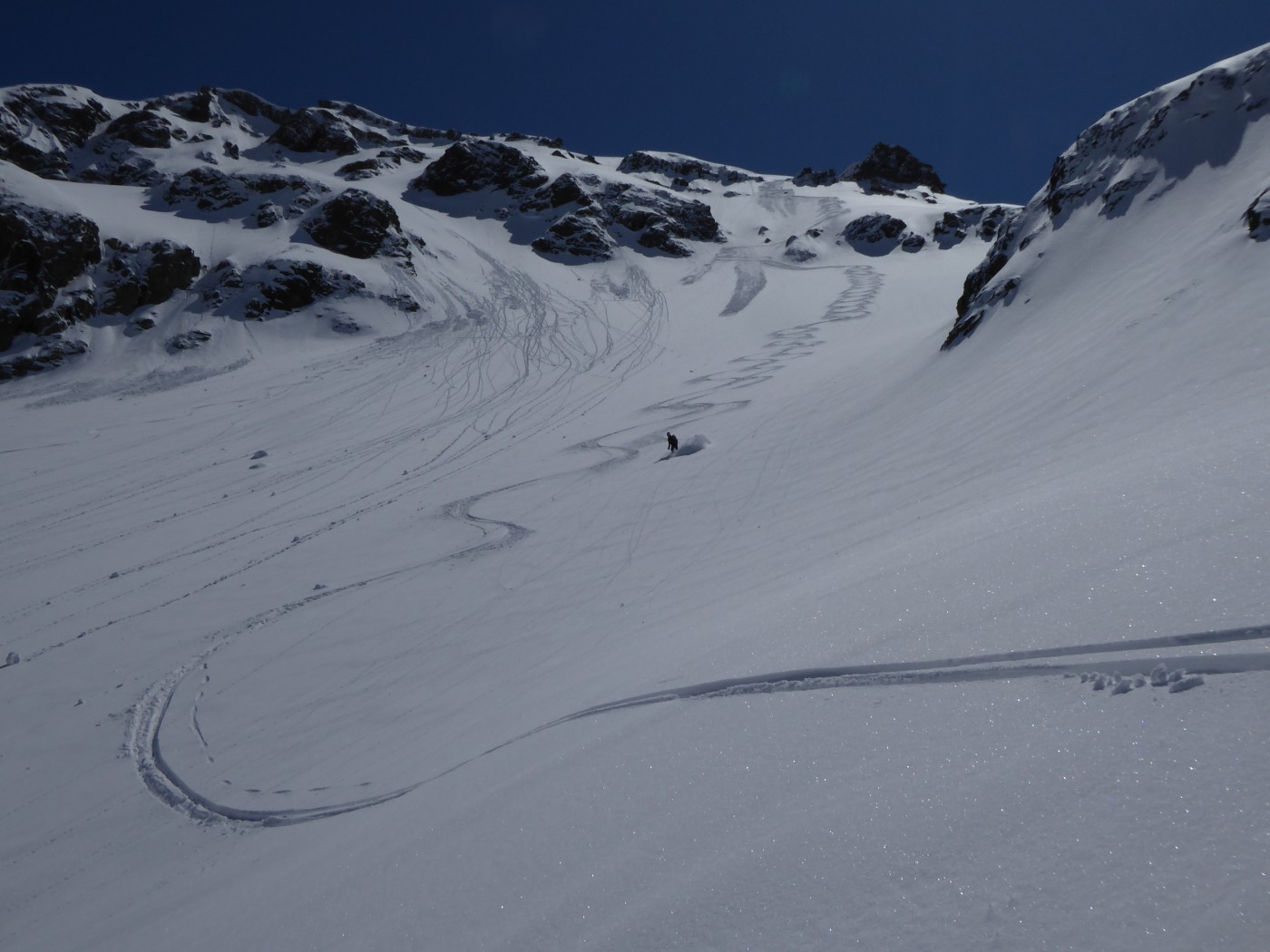 Encore une belle descente en poudreuse. La pente NO descendue est belle et assez soutenue (35°/400).