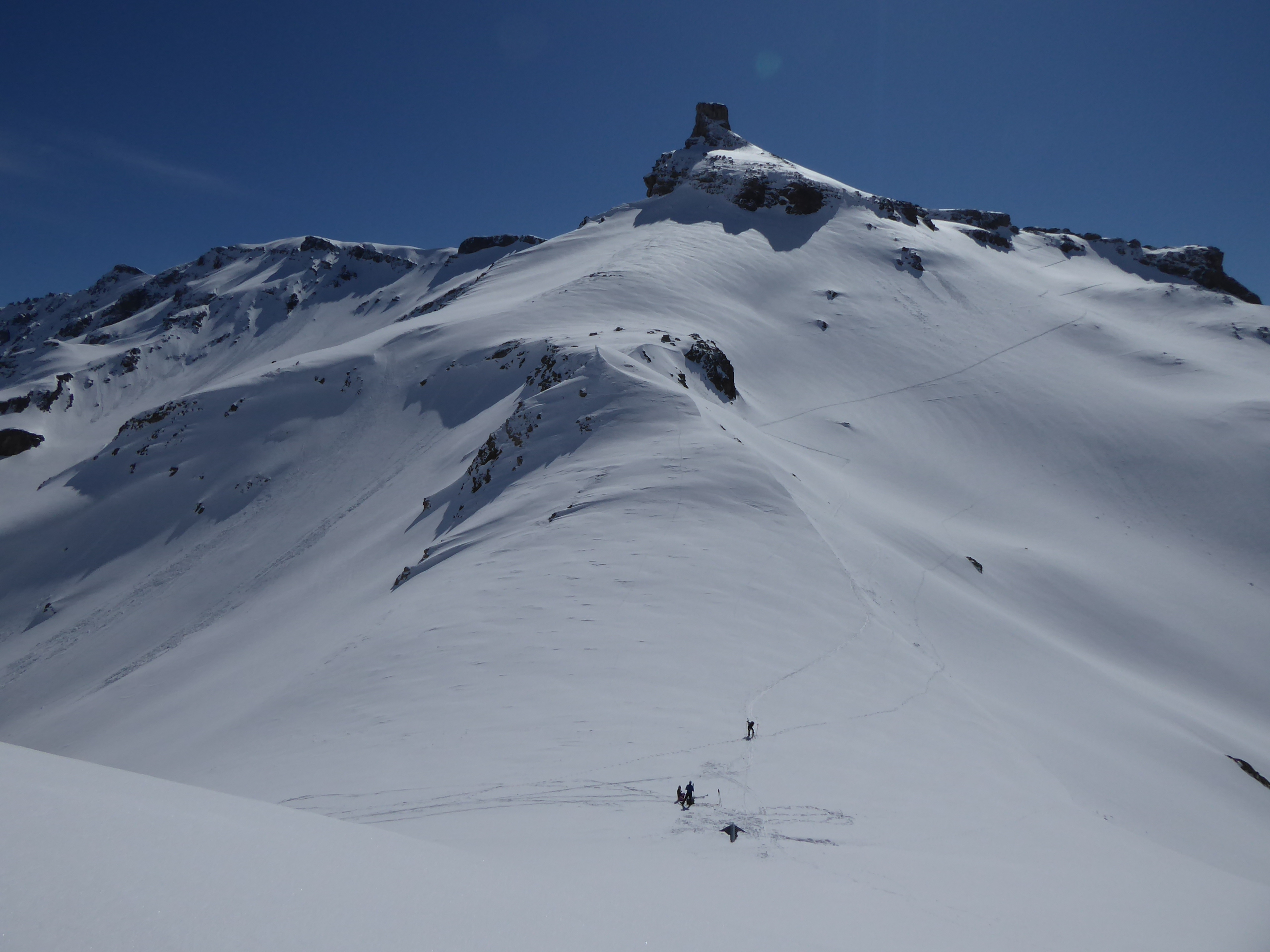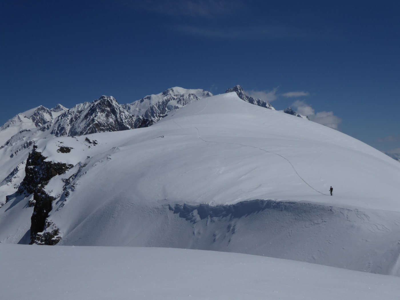 K1 avec descente par la pente NO dont l'entrée est 0,1km à l'ouest du sommet.