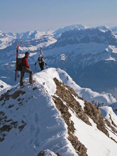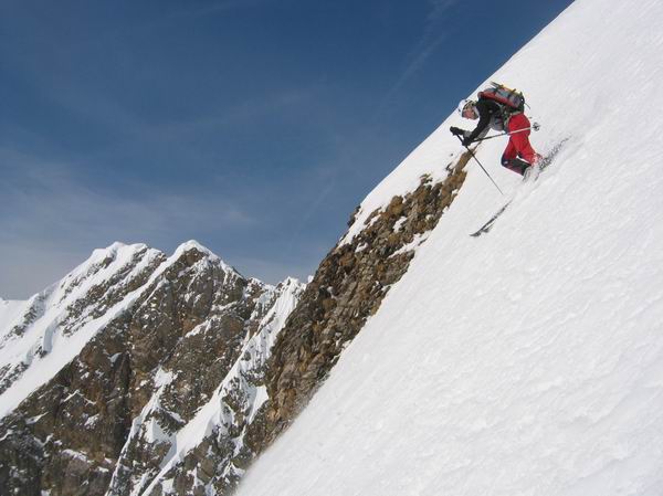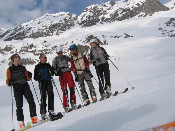 Incroyables versants SE des Aravis ou l'on passe en qqs mêtres d'une poudre parfaite en versant NE à la transfo partout ailleurs sans pratiquement de transition... Dan s le couloir, ça a déja chauffé fort, et les coulées avaient déja endommagé le bas du couloir. Des traces de reptations un peu partout
