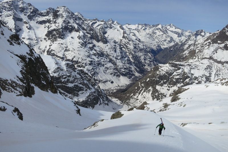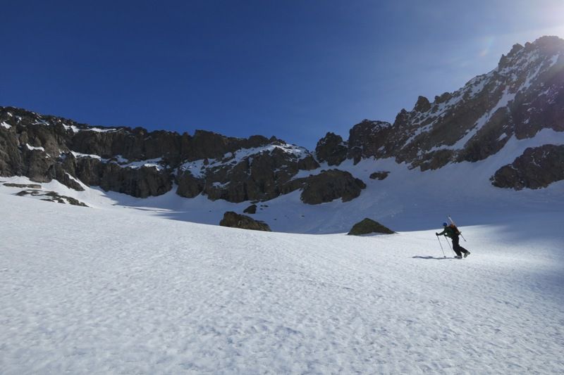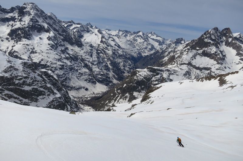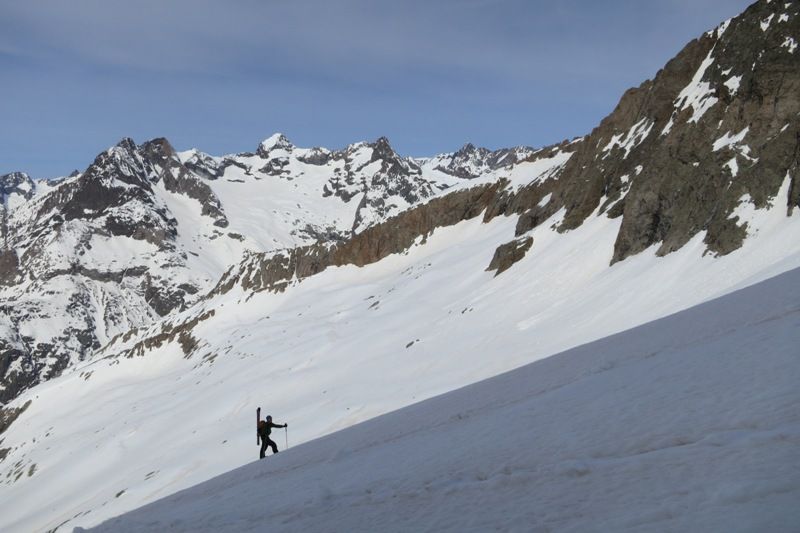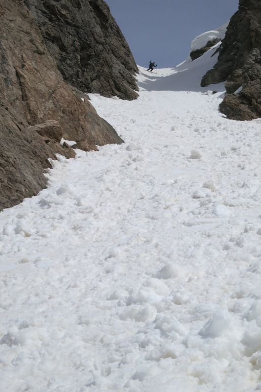 Après pas mal de tergiversations, on jette notre dévolu sur cette sortie bien adaptée à la touffeur du jour (18° à la Bérarde à 15h). Le couloir est effectivement bien protégé de l'astre sur sa rive gauche ; à 13h30, il restait une partie à l'ombre mais nous avons décidé de descendre (crampons pour moi) pour ne pas compromettre la suite qui était excellente
