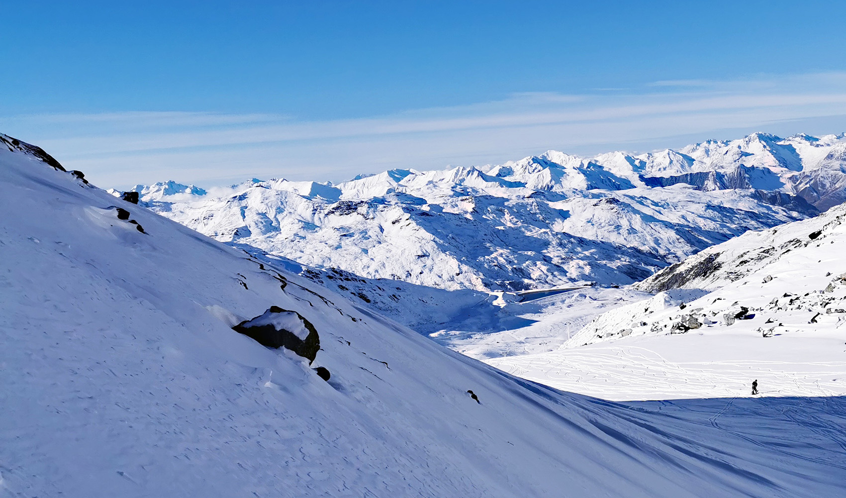 Des Deux Lacs jusqu'à sous le col de Thorens, en tirant à droite pour un arrêt à la dernière banquette ensoleillée vers 3000. Passe cependant plus haut à droite, mais sortie classique à gauche très peu enneigée.