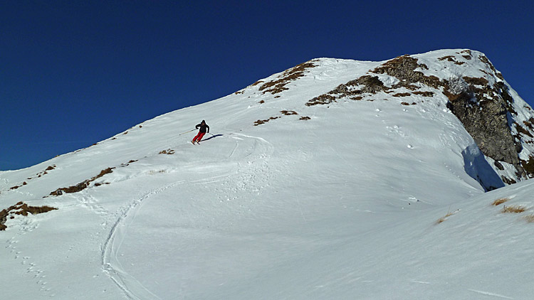 Un petit mais raide couloir ouest pour accéder au sommet de Tirebras et on bascule dans la facette sud avec une excellente neige presque transfo.