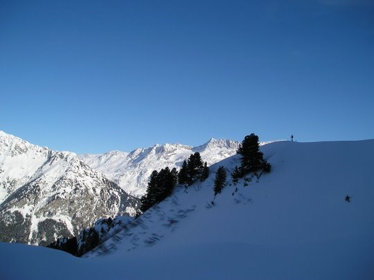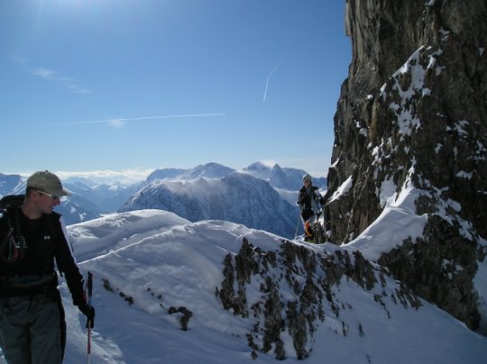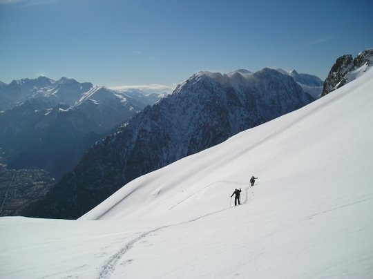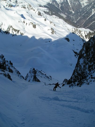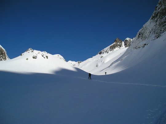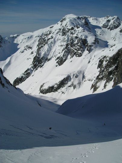 au lieu de redescendre par le petit col au pied du Charnier, on est monté en direction de celui-ci. Stop sous le sommet, conditions nivo pas très rassurantes, puis descente par J12 (merci Jip) pour Cyril et moi et par le petit col décrit par LSH pour les autres. Très bon ski dans les grandes pentes au-dessus du lac de Belledonne.