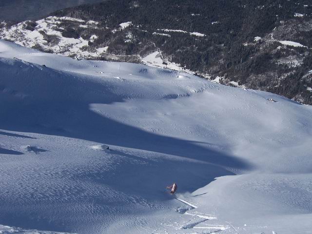 La couverture nuageuse des jours précédents a laissé du givre de surface en moyenne montagne, toujours aussi agréable à skier. Dommage qu'il n'y ait quasi rien en dessous. Les versants Est à Nord on été bien travaillés par le vent, la neige y est irrégulière, dense ou plaquée en surface, la glace est toujours là, à profondeur variable . Ca transforme vite dans les pentes SUD > 30°. Le meilleur est actuellement en ouest, en qaulité et en quantité.