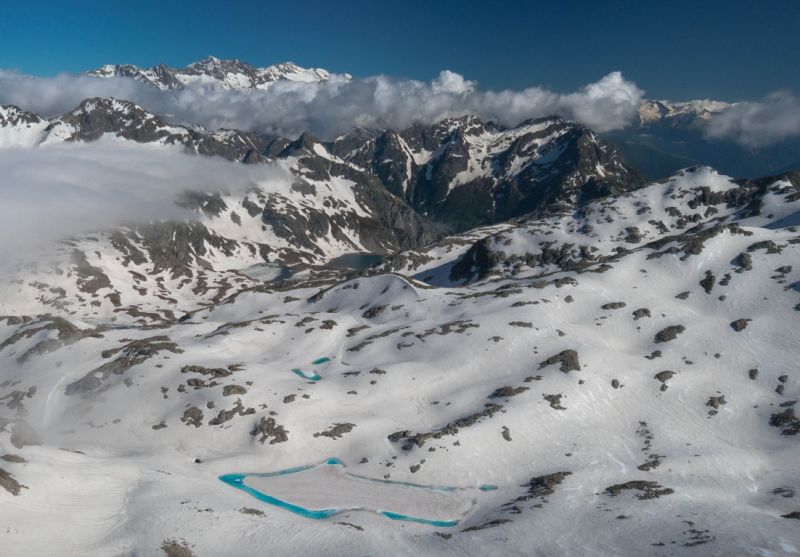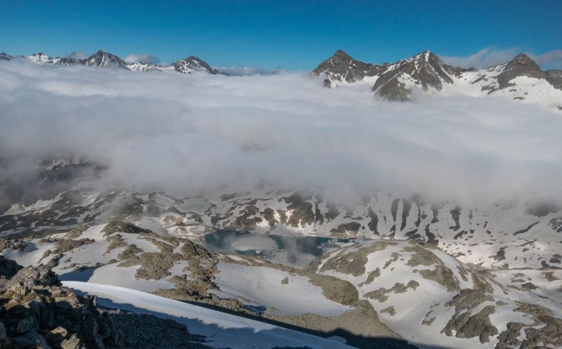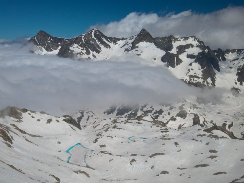 Prapoutel=>cime de la Jasse=>sud lacs du Vénétier 2000 m => col des l'Aigleton => Belle Etoile => face est sur lac du Cos => lac Cottepens => Cabottes => descente ouest => Eveque => descente ouest => cime de la Jasse => descente ouest. D+/D- = 2700 avec TS ; 3200 sans TS