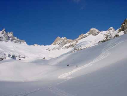 *de l'Alpe de Villard d'Arène atteint le 15 au soir : ->lac du Pavé->col des Chamois->descente ouest à 2700 ->refuge du Promontoire D+ : 1600 (+400 pour le refuge) ; D- : 500; ski : 4.2 ou 4.3 (voir article de VSH en rubrique "neige")