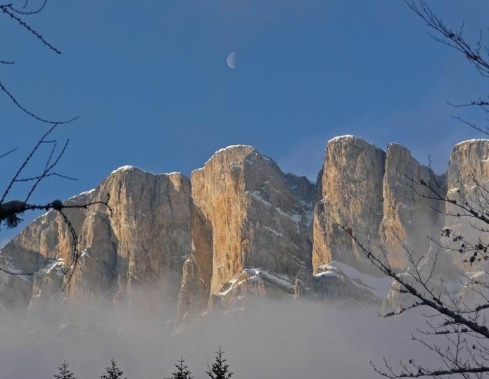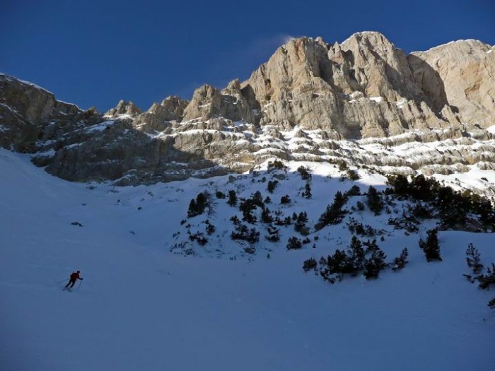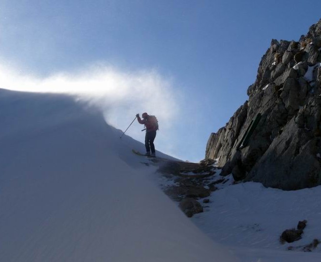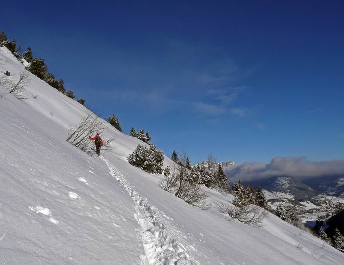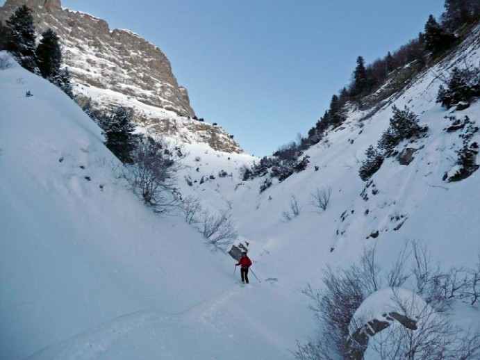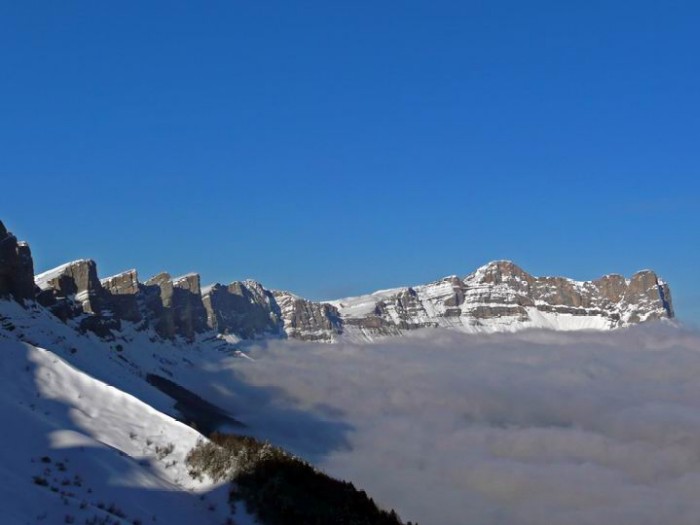 Partis pour monter au Petit puis grand Veymont, le fort vent nous en a dissuadé au pied de la face N. Du coup: traversée et remontée au Pas de la Ville, redescente sur la Chau, traversée "canadienne" sur les hauts plateaux jusqu'au pas de Berrièves, descente en Est par le ravin de Farnaud et dernier repeautage pour rejoindre le milieu des pistes de Gresse (Teleski de Gormaigne fermé)