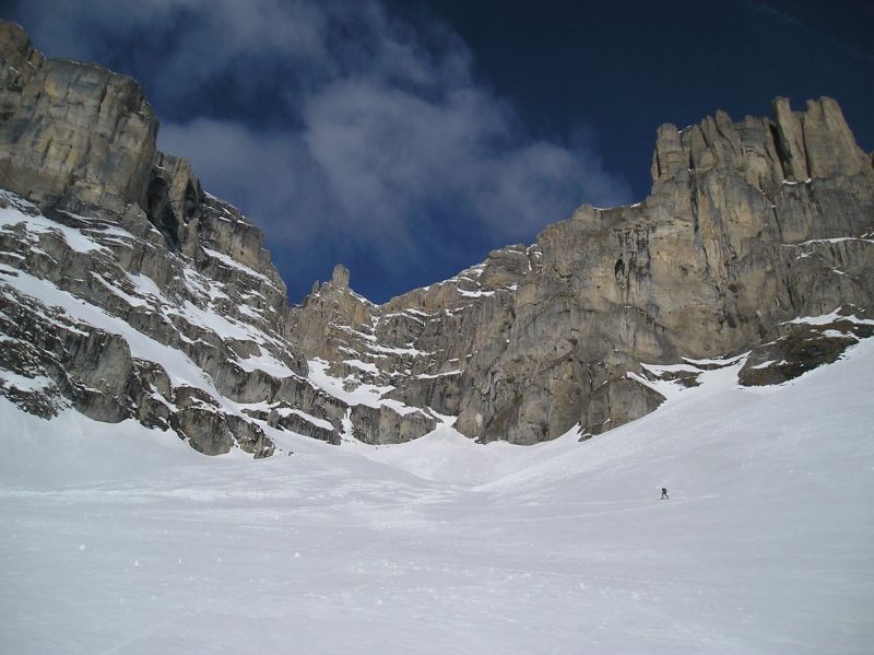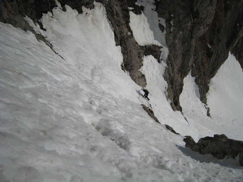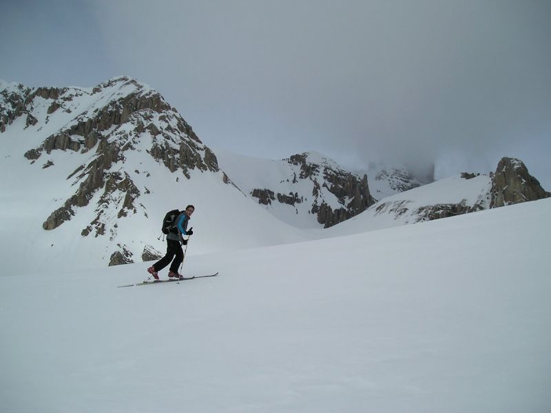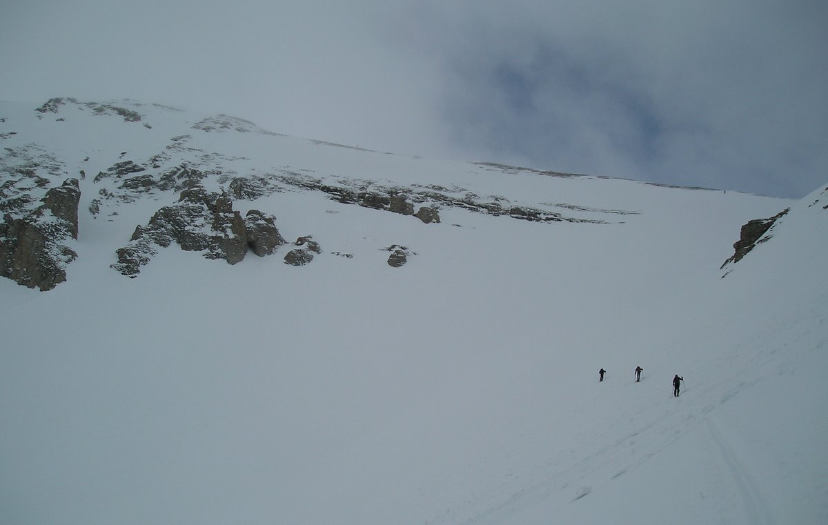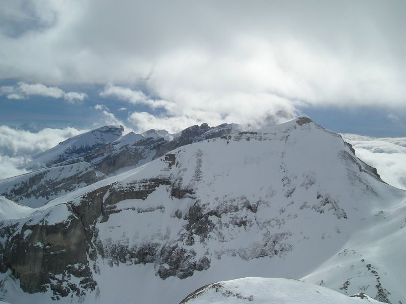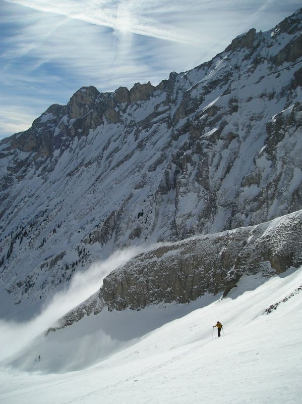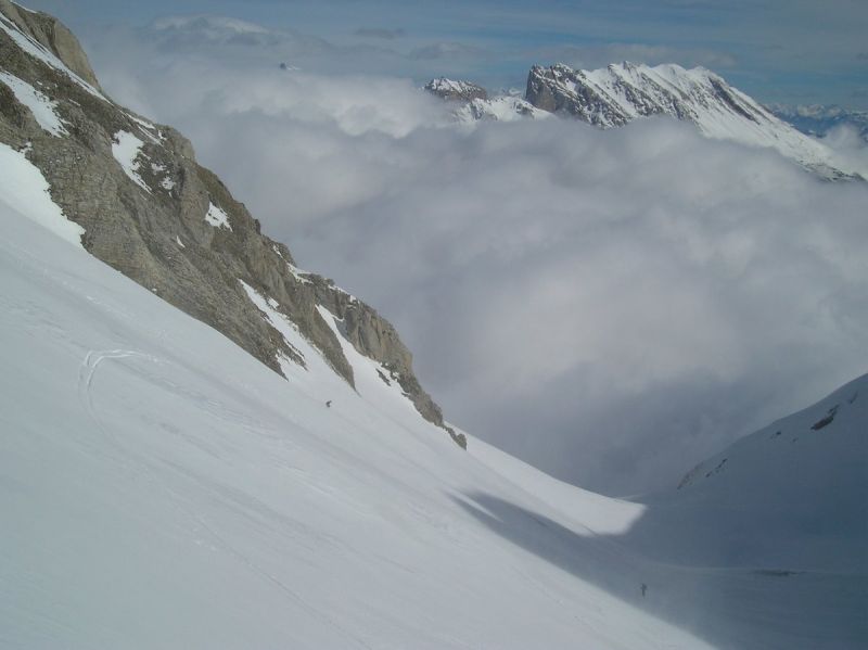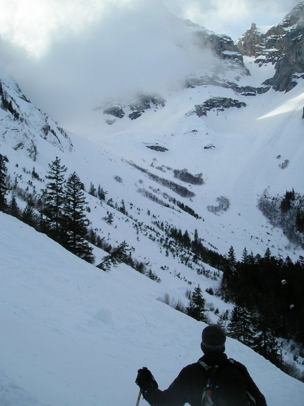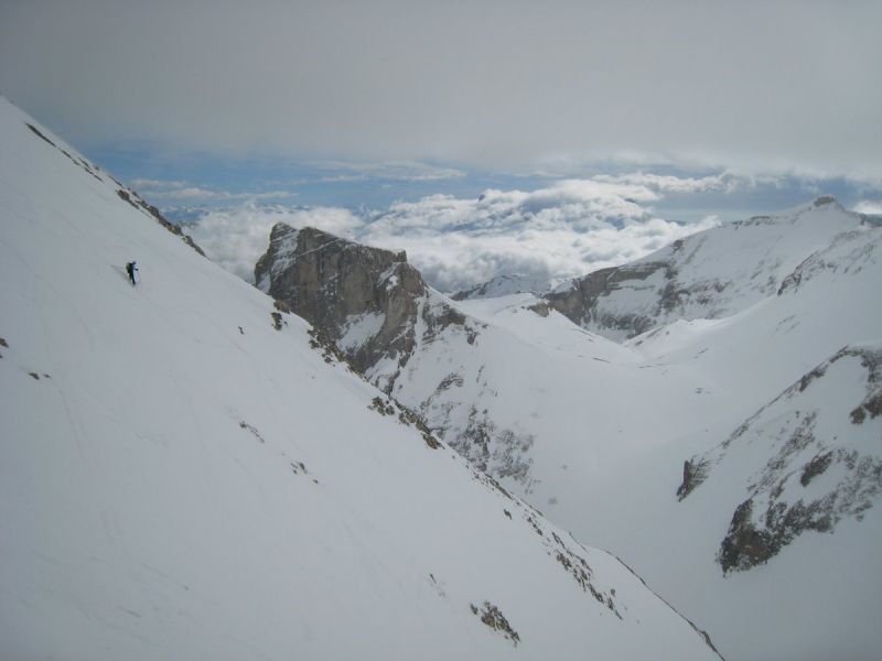 Le brouillard s'est dissipé environ 300m sous la cascade de la Fuvelle. Magic Dévoluy! Grosse chaleur ensuite dans la montée. La passage de la cascade est en bonnes conditions. A la sortie de la combe, la T°c s'est nettement rafraîchie et on s'est fait un peu secoué sur l'arête terminale de la tête de la Cavale. Très beau circuit laissant admirer les faces nord de la Tête des Ombres, de l'Aupet, du petit Ferrand. Vue sur l'Obiou bouchée.