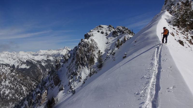 Superbe petit circuit avec une neige et une lumière exceptionnelles. L'occasion de saluer l'ami Alain dont le cairn est invisible dans la corniche du col. Il faudra le déplacer cet été.
