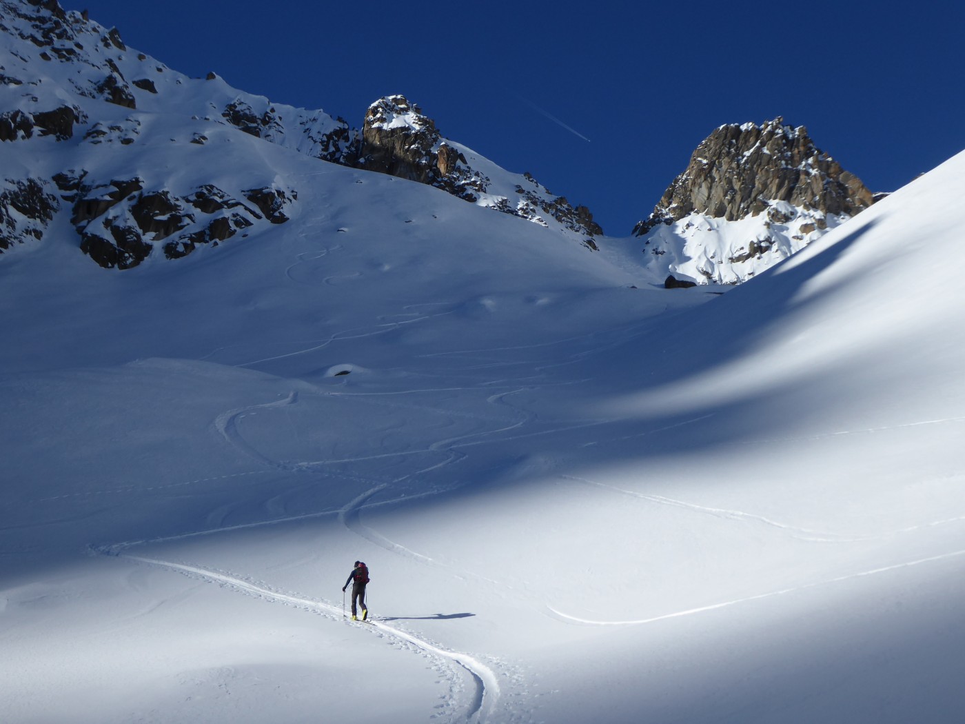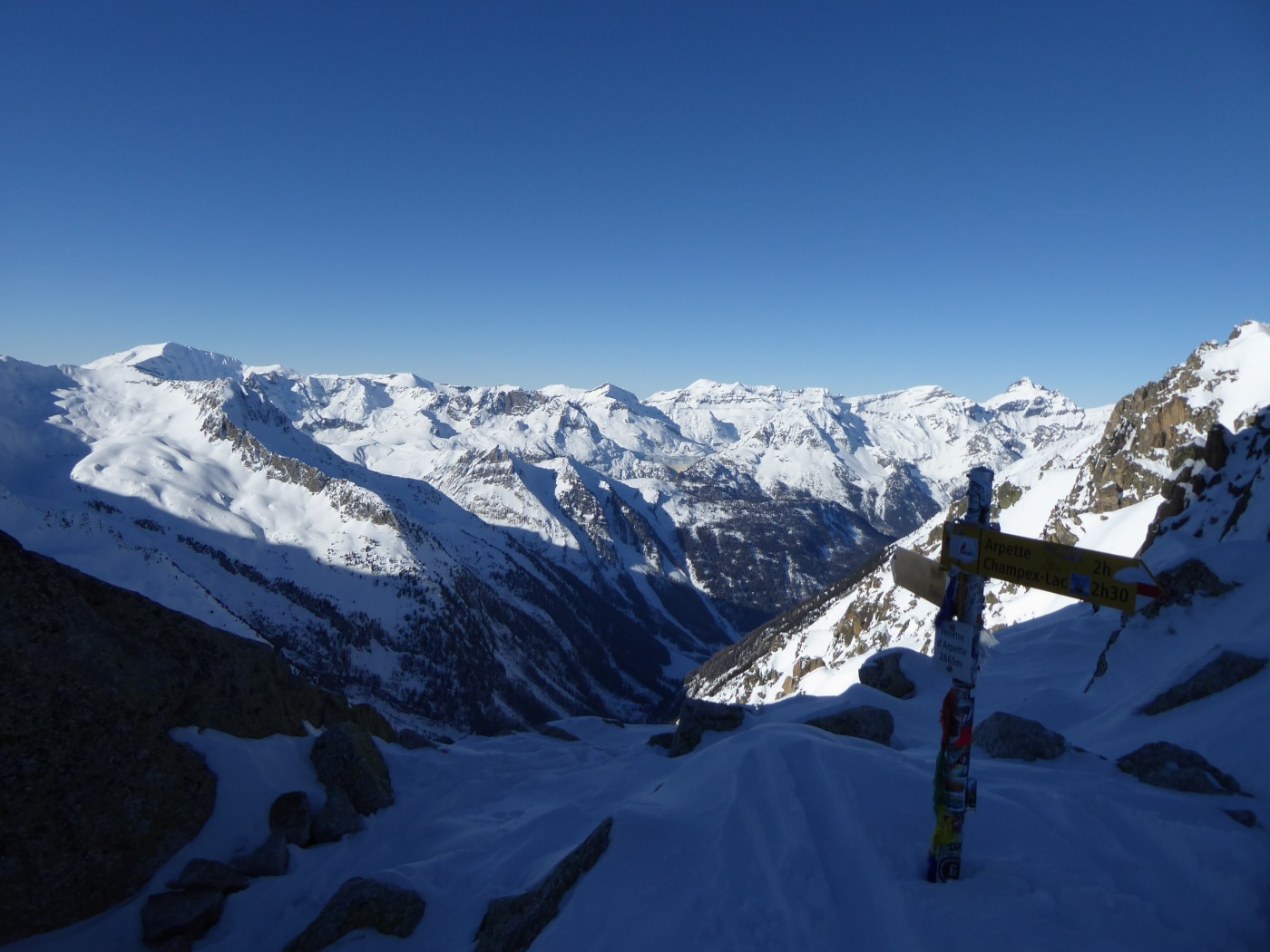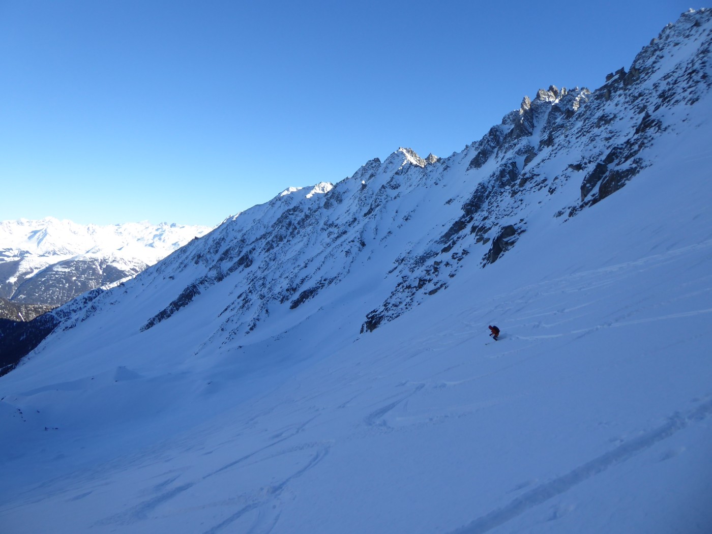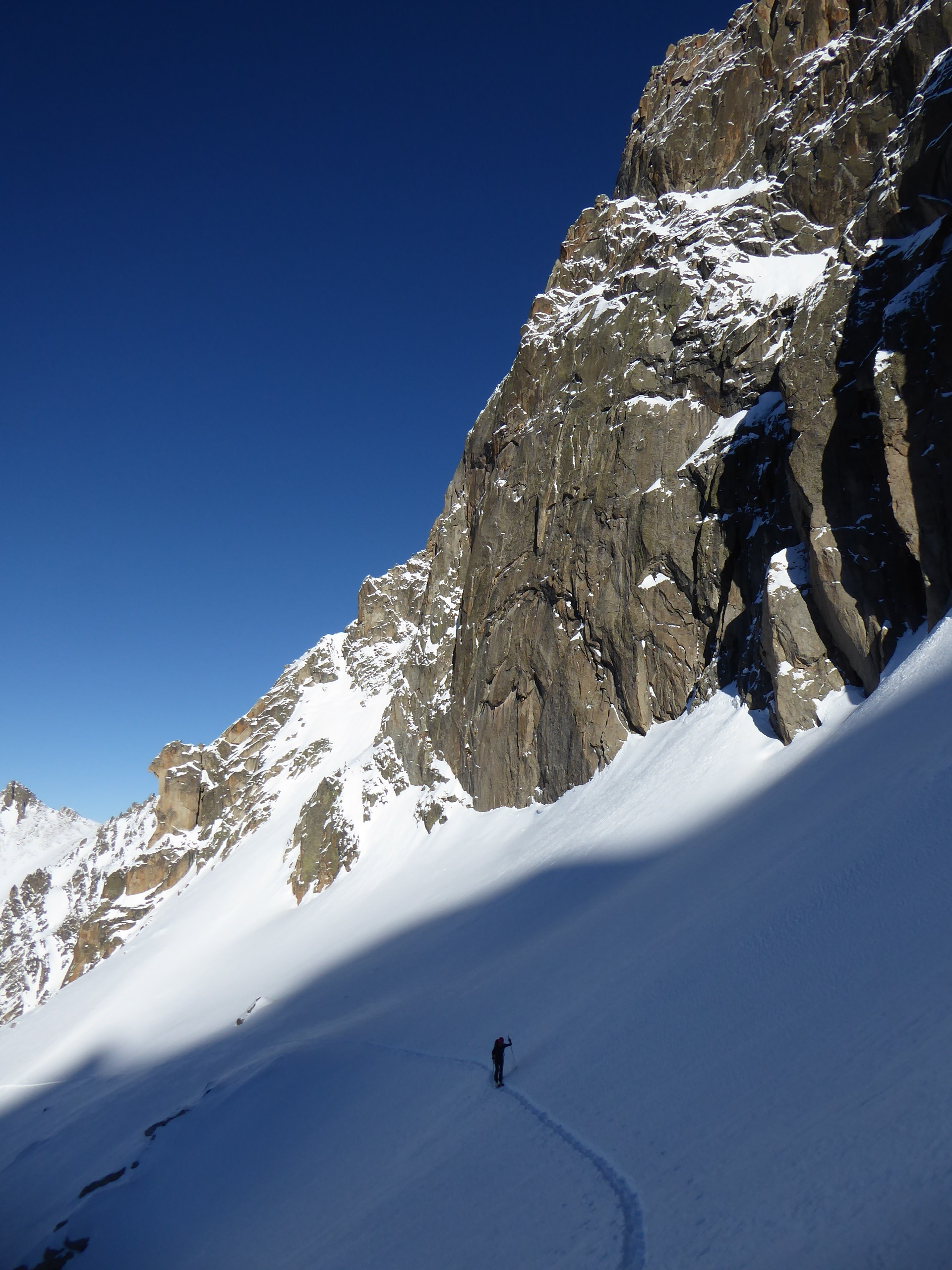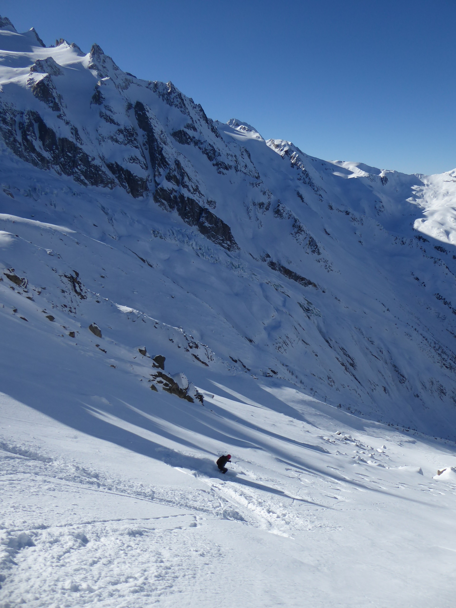 Vraiment une belle boucle qui permet de profiter du soleil dans la partie côté Trient. Pas plus de monde que jeudi (env. 20) dans le val d'Arpette (nettement plus sur les pistes du télésiège de la Breya). Vu le nombre d'itinéraires, on ne se gène vraiment pas. La fenêtre d'Arpette était bien tracée (merci !). Par contre la remontée au col des Ecandies ne l'était pas. Juste une vieille trace dans le couloir qui est en neige inconsistante sous une croute. Le val d'Arpette est pas mal tracé mais reste agréable à skier en cherchant un peu.