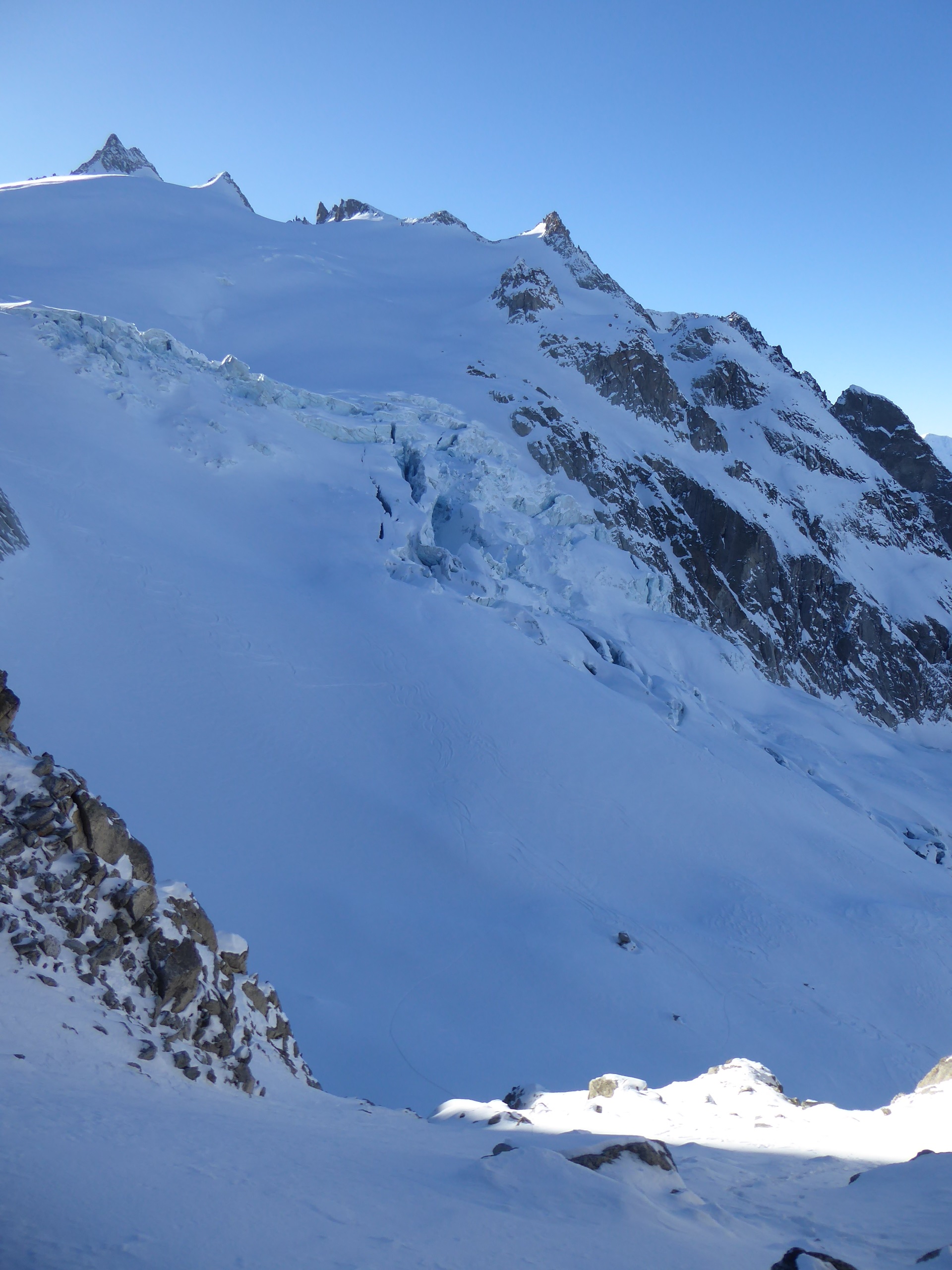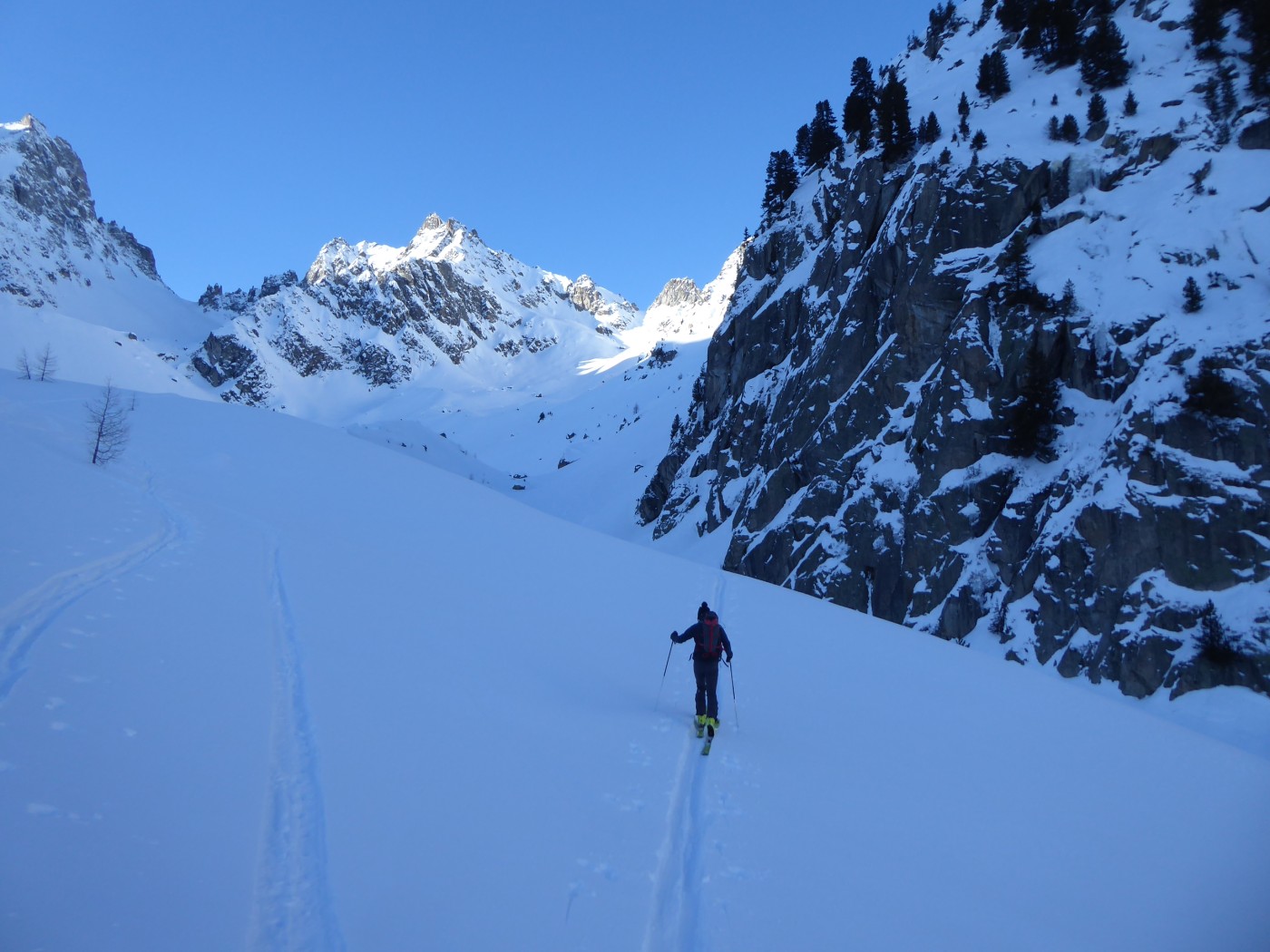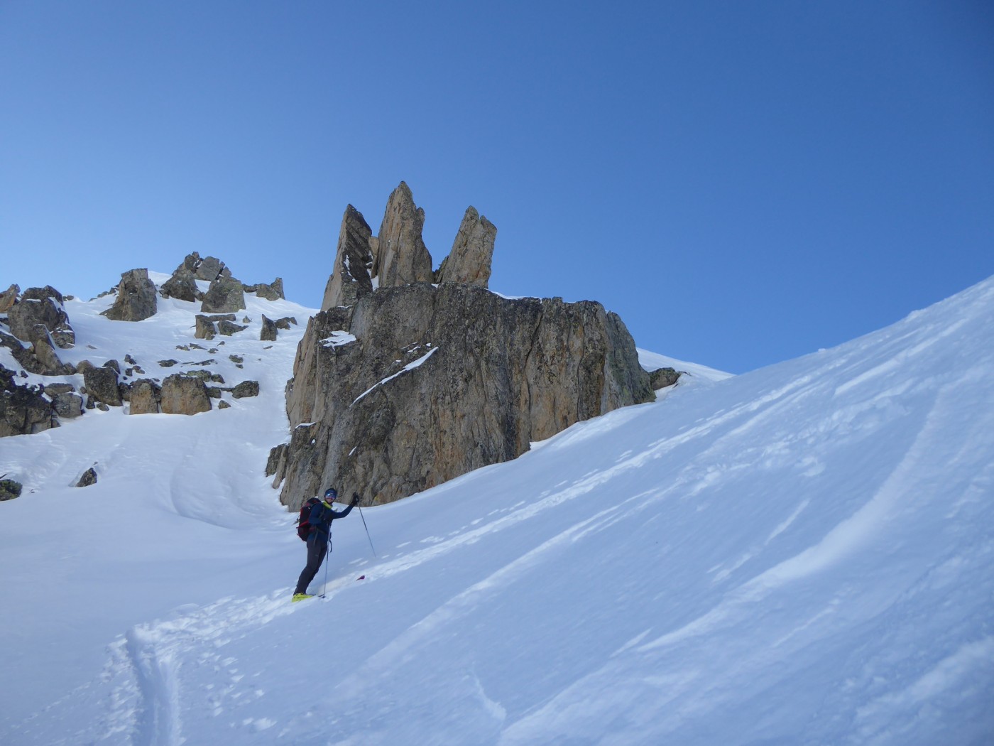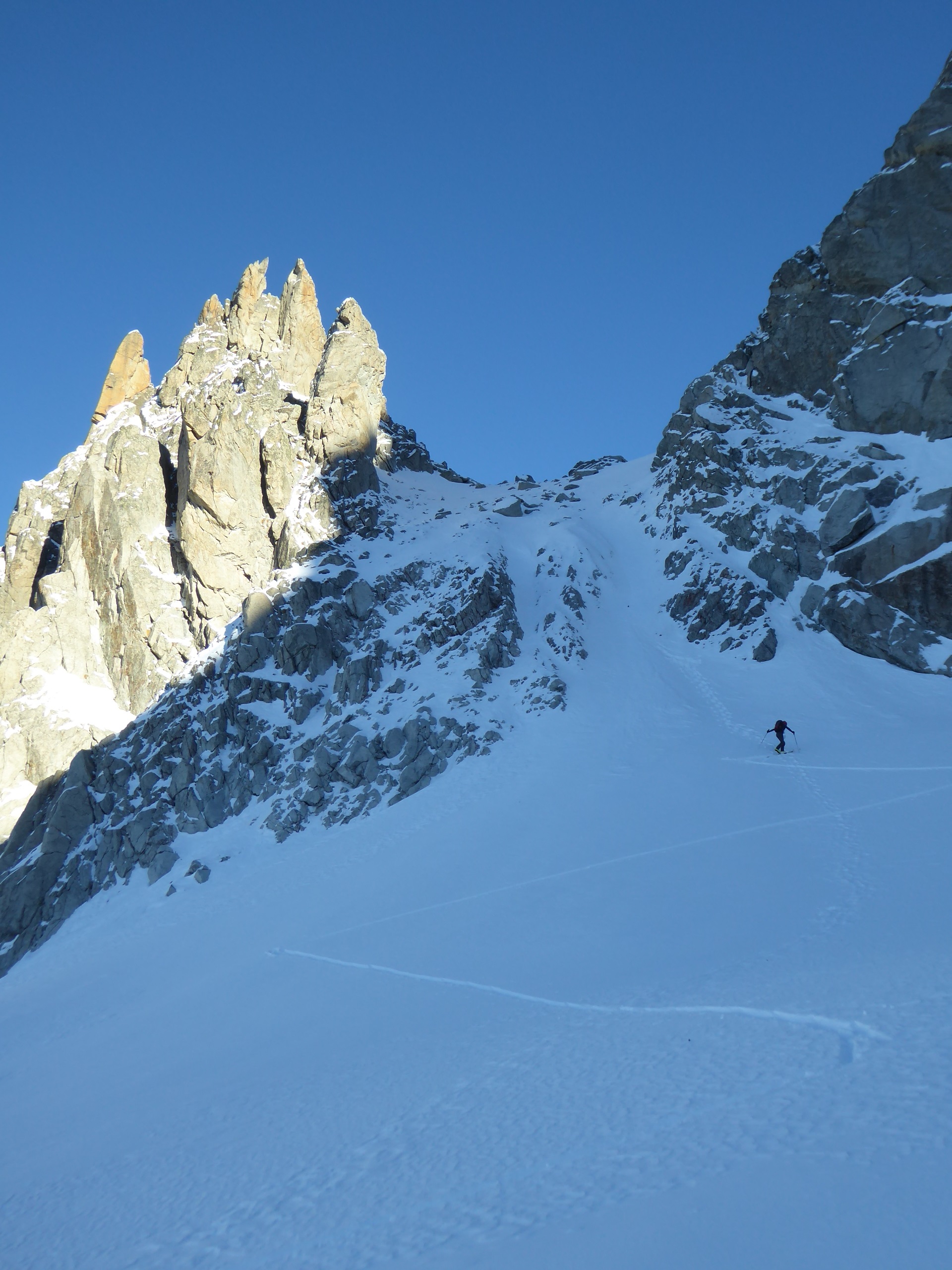 Vraiment une belle boucle qui permet de profiter du soleil dans la partie côté Trient. Pas plus de monde que jeudi (env. 20) dans le val d'Arpette (nettement plus sur les pistes du télésiège de la Breya). Vu le nombre d'itinéraires, on ne se gène vraiment pas. La fenêtre d'Arpette était bien tracée (merci !). Par contre la remontée au col des Ecandies ne l'était pas. Juste une vieille trace dans le couloir qui est en neige inconsistante sous une croute. Le val d'Arpette est pas mal tracé mais reste agréable à skier en cherchant un peu.