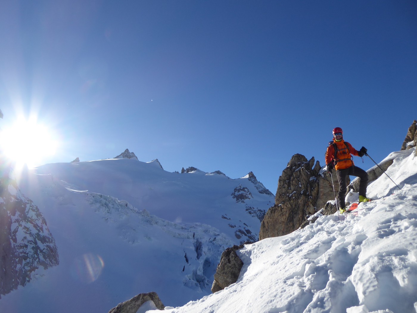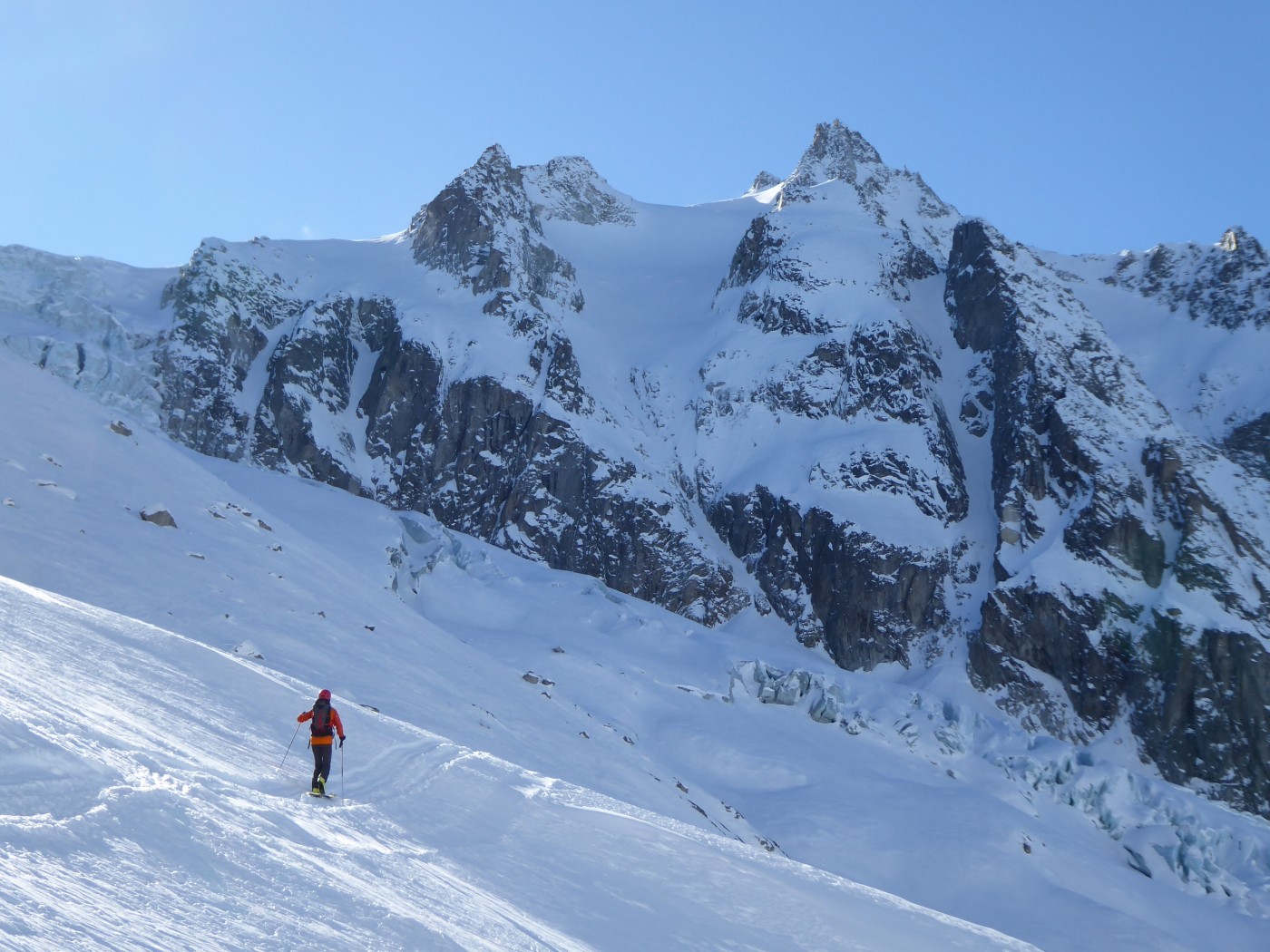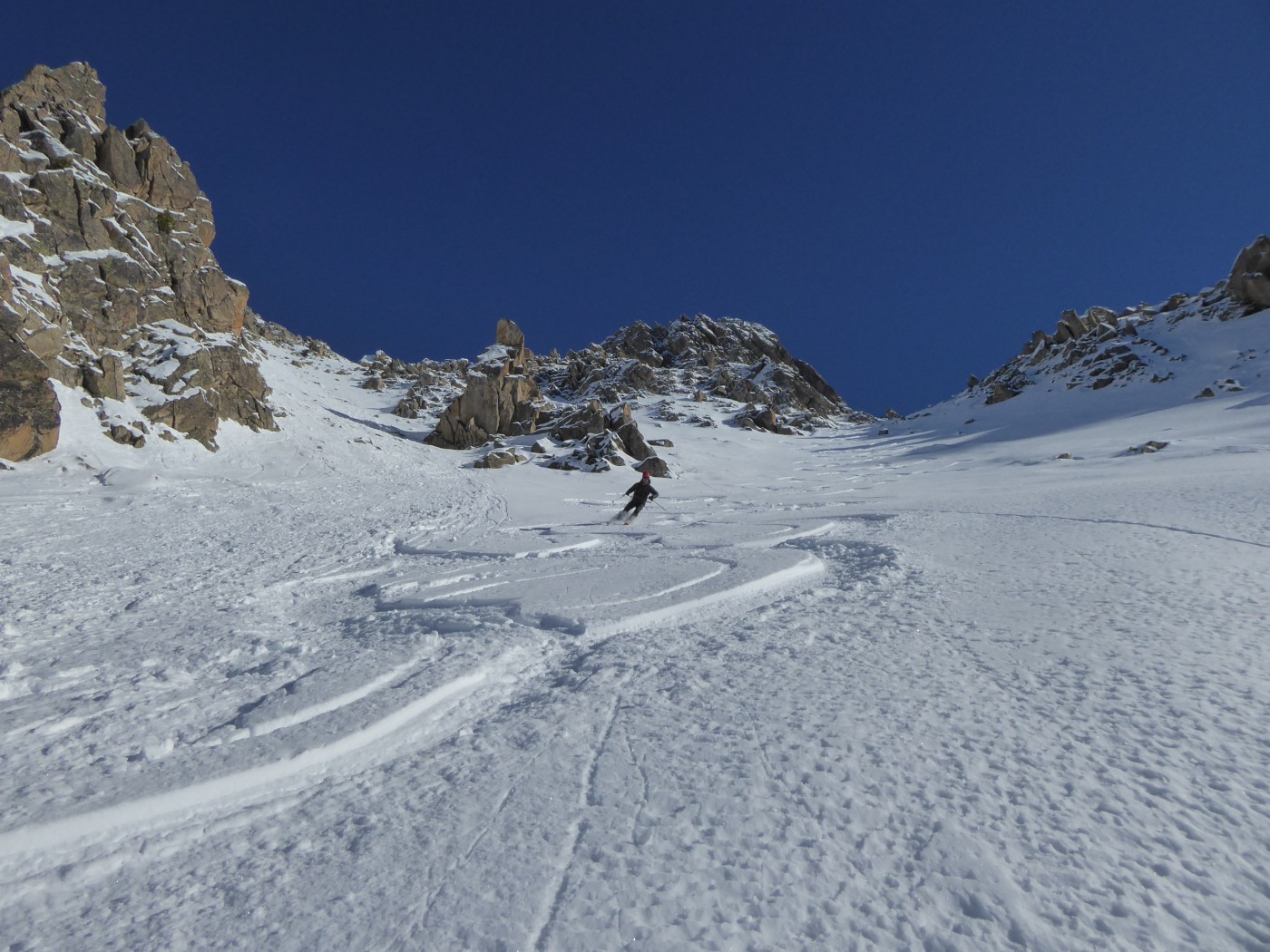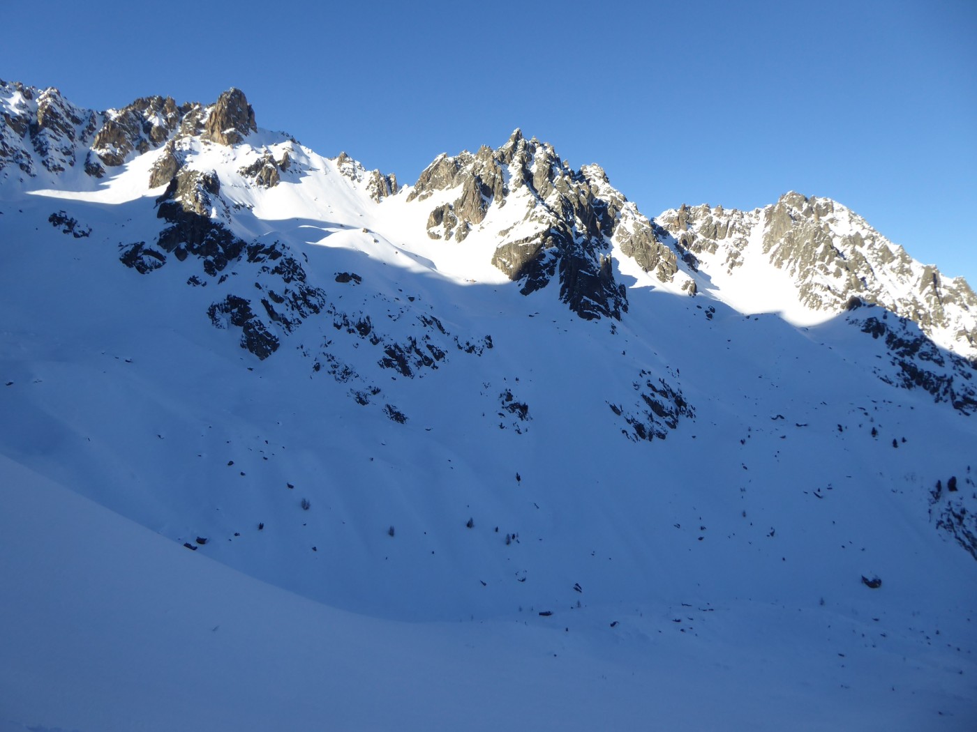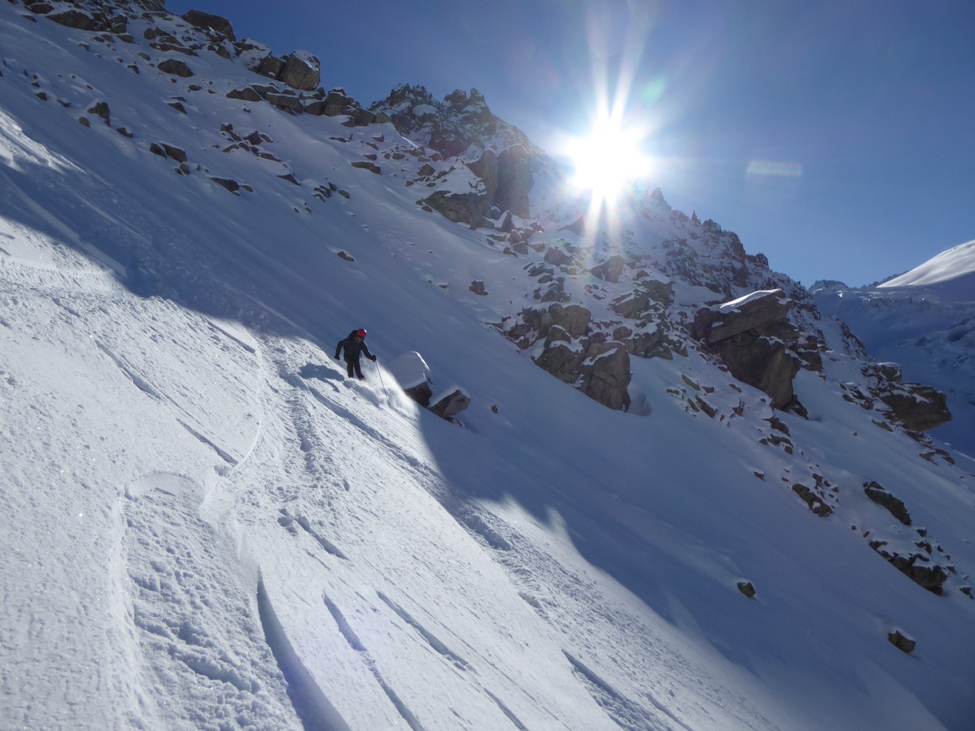 Vraiment une belle boucle qui permet de profiter du soleil dans la partie côté Trient. Pas plus de monde que jeudi (env. 20) dans le val d'Arpette (nettement plus sur les pistes du télésiège de la Breya). Vu le nombre d'itinéraires, on ne se gène vraiment pas. La fenêtre d'Arpette était bien tracée (merci !). Par contre la remontée au col des Ecandies ne l'était pas. Juste une vieille trace dans le couloir qui est en neige inconsistante sous une croute. Le val d'Arpette est pas mal tracé mais reste agréable à skier en cherchant un peu.
