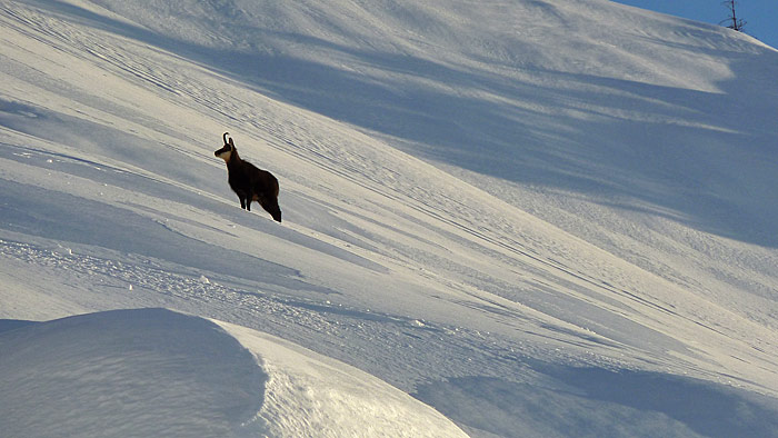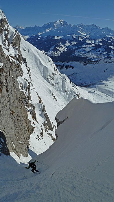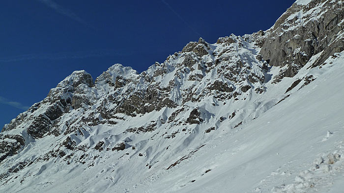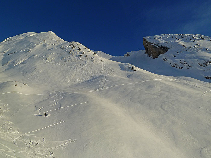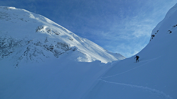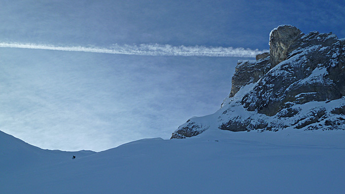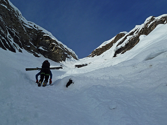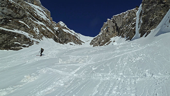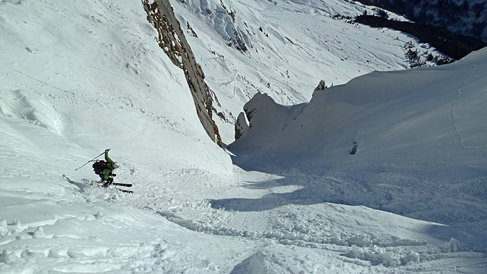 Un peu de toutes les neiges dans le couloir est du golet de la Trouille : le haut est crouté à poudreux puis la rive gauche est en réchauffée, l'axe est dur et la rive droite en poudre à croûte.