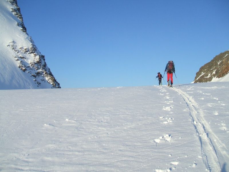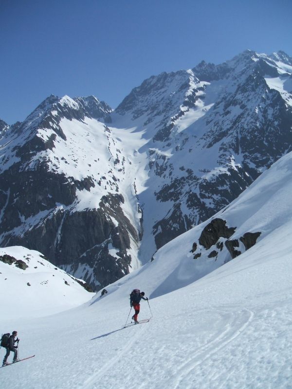 Du fait du très bon regel et de son orientation ouest, le couloir n'a pas décaillé d'un pouce. Ce n'est pas le cas du couloir remonté juste en face, qui, dès 9h00 était très bien revenu, voire même trop bien. Aux dires du gardien, l'enneigement très bon de cette année permet de franchir tous les passages techniques en peaux. Tant mieux car on gagne un temps précieux.