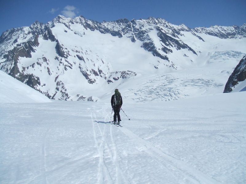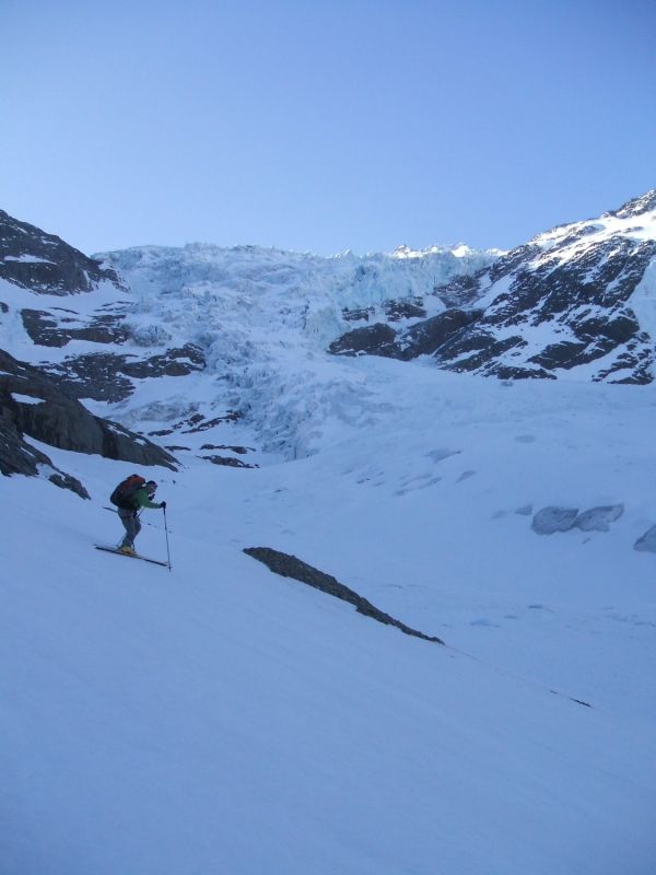 Les 1300 m du couloir, par endroits raide, encombré de boules dans le bas, exposé aux chutes de séracs, sont avalés en un peu plus d'une heure par les 11 membres du groupe. A 1660m, sous un glacier qui tombe à la verticale sur près de 700m il ne reste plus qu'à remonter au soleil dans des pentes raides et surchauffées pour prendre pied sur les glaciers supérieurs, peu inclinés mais en neige parfaite.