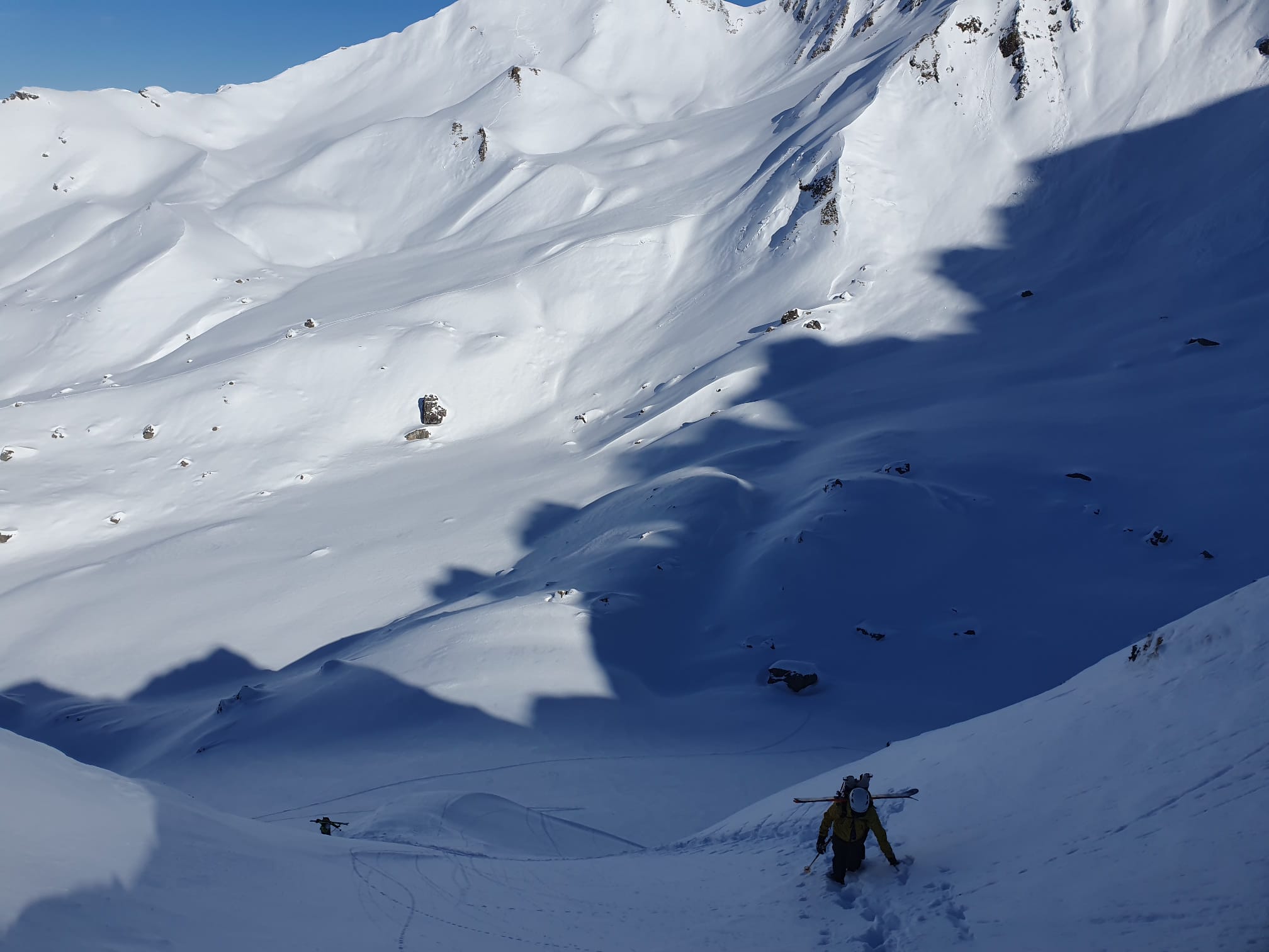 Dimanche, on a suivi B10.1 (col du Grand Fond, brèche de Parozan, crête ouest de l'aiguille du Lac, col du Bresson). Comme il restait du temps, nous sommes remonté presque au col de la Charbonnière pour skier les belles pentes N qui font face à la Piera Menta.