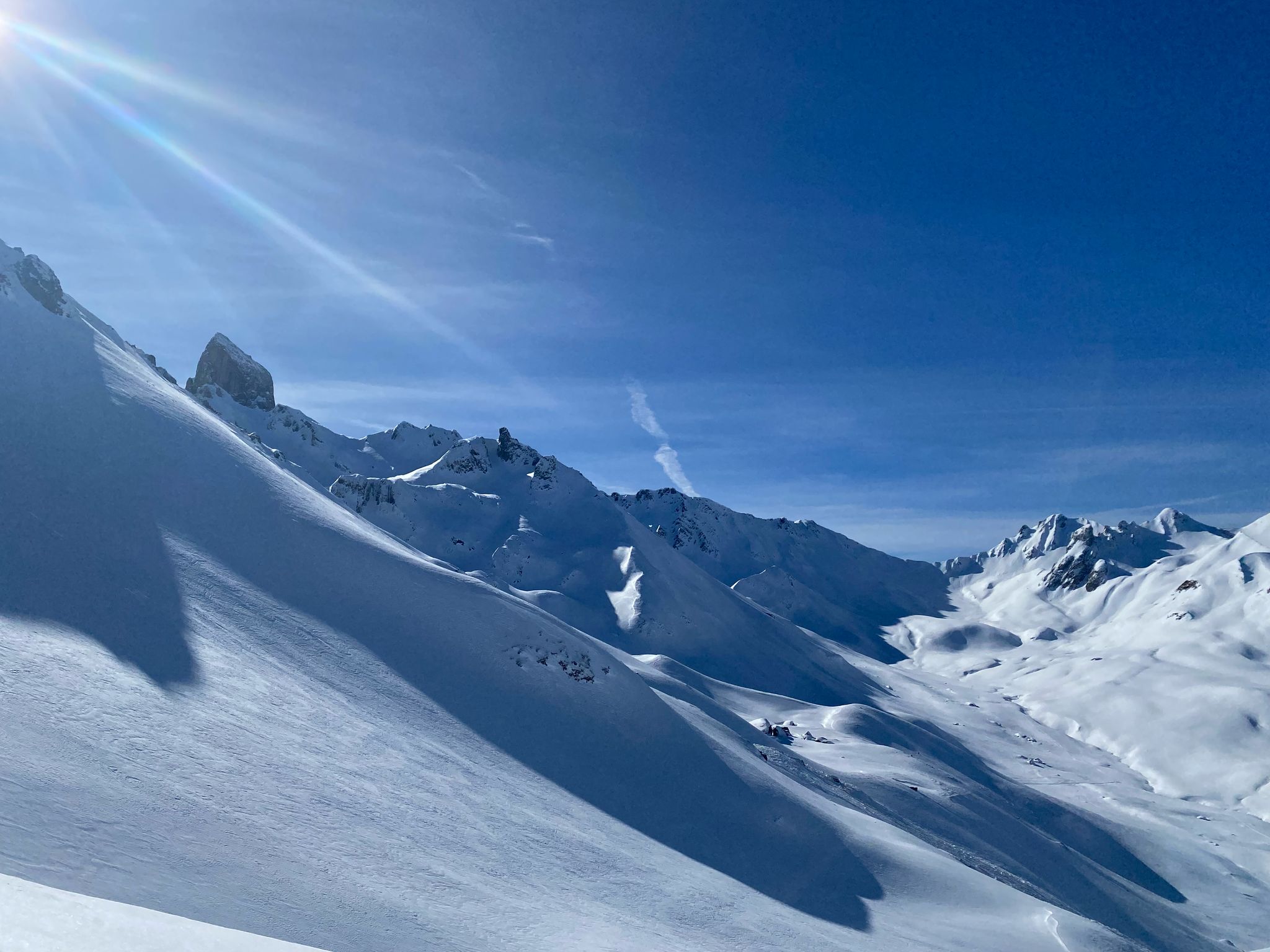 Les 20cm tombés vendredi n'ont pas encore été transformés. La neige des versants ensoleillés à de 2000m est lourde voir collante l'après-midi, croûtée le matin. Au dessus, encore légère en versant froid.