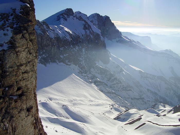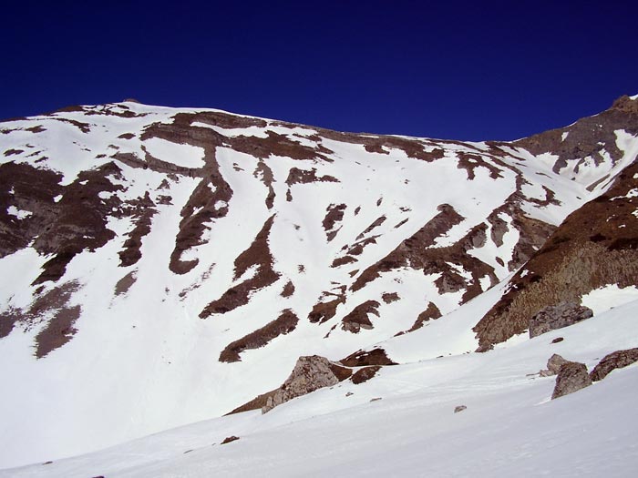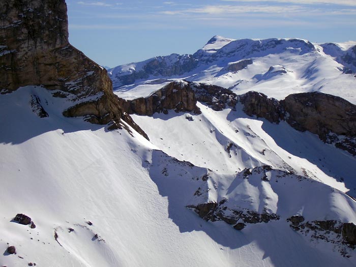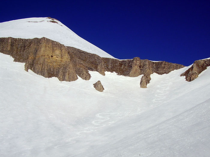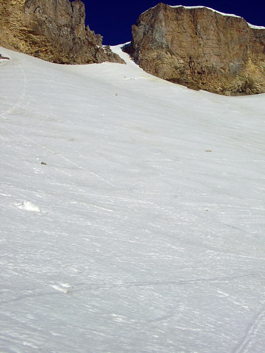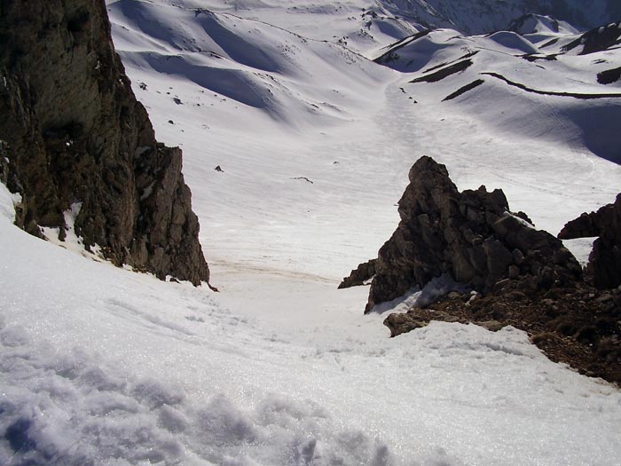 De la tête du Lauzon, j'espérais voir le bas du couloir, mais on n'y voit rien de là. Dans le doute, et au vu de la fonte qui s'est bien intensifiée dans les versants au soleil, j'ai estimé que l'étroiture n'était plus en conditions, et je suis redescendu sur le col de Charnier. La bande de neige sous le lac du Lauzon est encore praticable, mais le reste est bien dégarni. Très bonne neige dans le Fleyrard et Clausis. J'ai dû monter à pied le couloir final d'accès au rocher Rond, qui doit approcher les 45° sur 50 m. La neige était revenue mais pas trop molle sur fond très dur et j'aurais apprécié les crampons, que je n'avais pas pris, pour une fois... Mais avec le piolet, ça passait bien et ce n'est pas du tout expo. La descente du rocher Rond (je ne suis pas allé au sommet) était alors à l'ombre et la neige de type gauffrée assez dure. Retour à La Chaup sans déchausser.