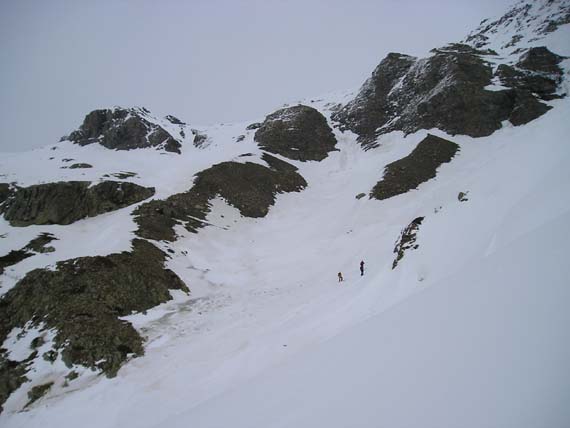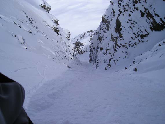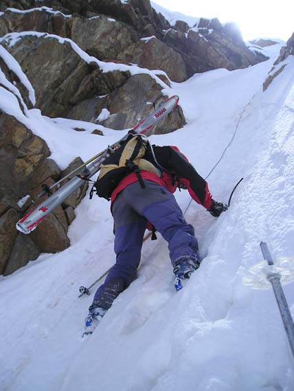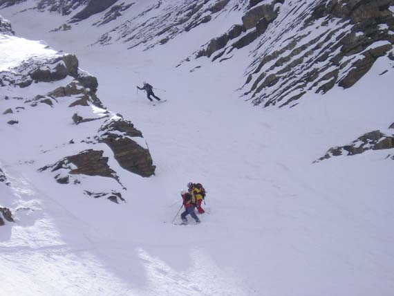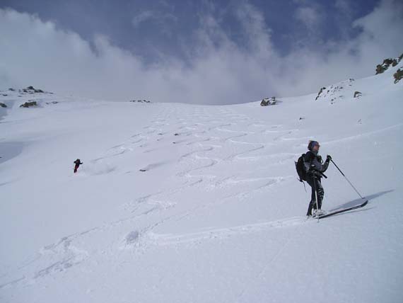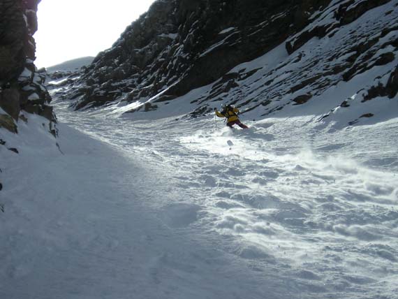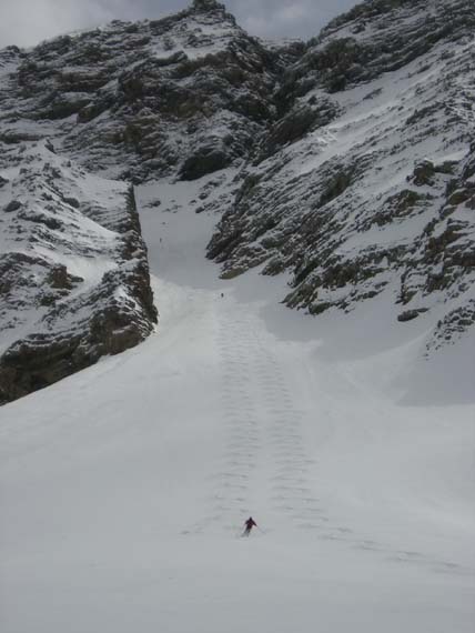 Belle revanche prise sur presque la même sortie il y a 1.5 an (course 02-225). Cette fois ci nous avons pu passer le pas de la cavale sans encombres, mais en hiver en grosse poudre il est à déconseillé, à moins d'être sûr des conditions. Le couloir, moins rempli en haut (nous étions partis à skis du haut en décembre 2002) est toujours aussi étroit et délicat à skier en raison de son aspect goulotté: accumulations qui plantent les skis. Balade bien dépaysante et contrastée: après les remontées (bouh...) on est seuls pour le reste de la journée dans des vallons quasi vierges de toutes traces.
