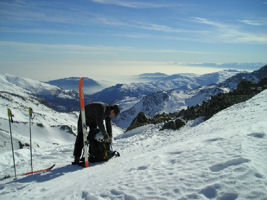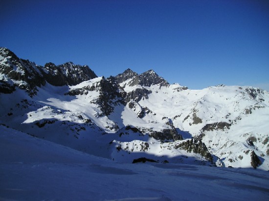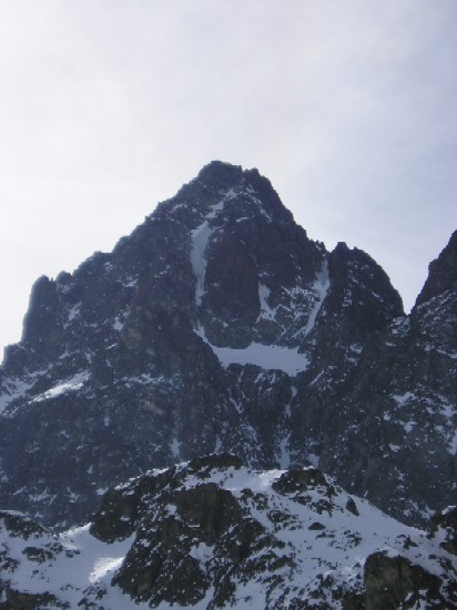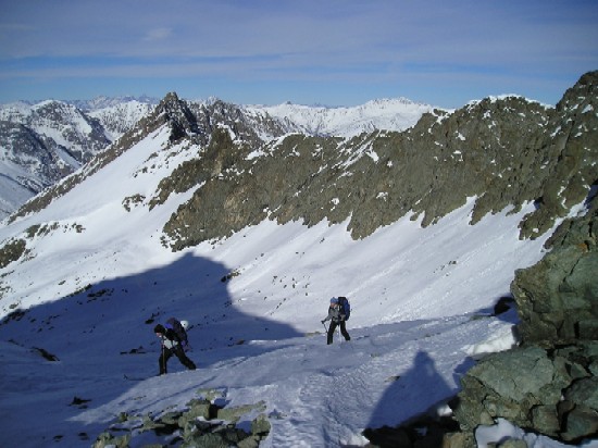 Descente de la Traversette très exposée (E4) sur les 15 premiers mètres en traversée. La moindre boite est fatale (barre de 100 m de haut).A négocier avec prudence si la neige est béton. Sinon nous nous sommes retrouvés au milieu des coureurs de la course de ski alpinisme "giro viso" qui descendait du refuge Giacoletti en trombe... pour ensuite nous retrouver tous seuls au boui-boui Quintino Sella (8? pour les CAI, 16 ?!!! pour les non CAI)