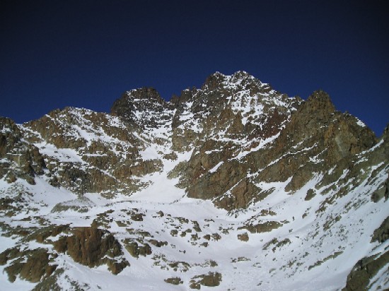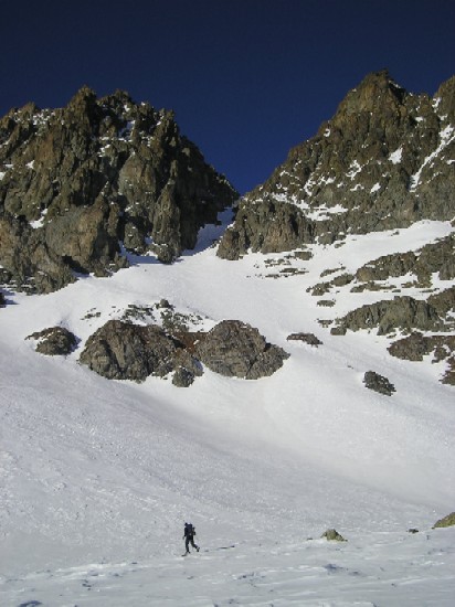 Variante alpine du tour classique pour cette journée magnifique qui permet de passer sous la face S du Viso. Des traces de skis sont visibles dans la face S du Viso (jusqu'au sommet ???). Le vallon au Sud du Viso est magnifique et sauvage, cependant quelle déception en arrivant dans la combe déplumée sous le rocce di Viso: les hautes falaises qui bordent la rive N de la combe ont du faire un effet four solaire qui a fait fondre toute la neige: frustrante descente à pieds sur 200m avant de pouvoir chausser. S'ensuit un passage de la largeur des skis voire qqs cm de moins dans du 45-50° pour arriver sur une barre: passe?, passe pas?= ouf une traversée à pied vers le N permet de rejoindre de belles pentes enneigées. Bref, une petite pointe d'adrénaline pout pimenter ce raid par cette descente à vue que j'avais déjà réalisé en septembre à pied, il y a 4 ans. Enneigée complètement elle doit ê
