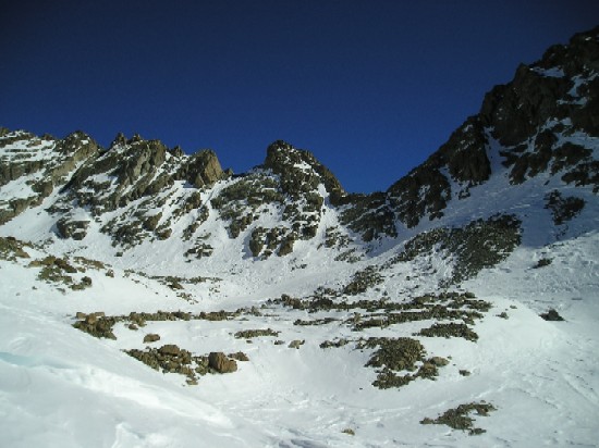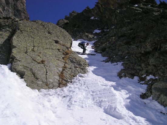 Variante de E8 pour eviter la longue montée sur le refuge Vallanta: montée par le couloir E du passo delle Sagnette: Descente à pied sur 50m du versant W en suivant le sentier d'été dans les barres puis traversée sous la face sud du viso en suivant la rive droite des lacs delle forciolline et par 2 courtes remontées on rejoint la combe NO-O entre le rocce di Viso et le bivacco Berardo. On descend cette belle combe encaissée (35-40°sur 500m) ...à pied puis à ski dès que l'enneigement le permet. Par une étroiture à 45-50°puis une traversée à droite vers 2323 (barres au dessous)on rejoint le pian Para 200m sous le refuge. Cotation: 4.1/E3-4