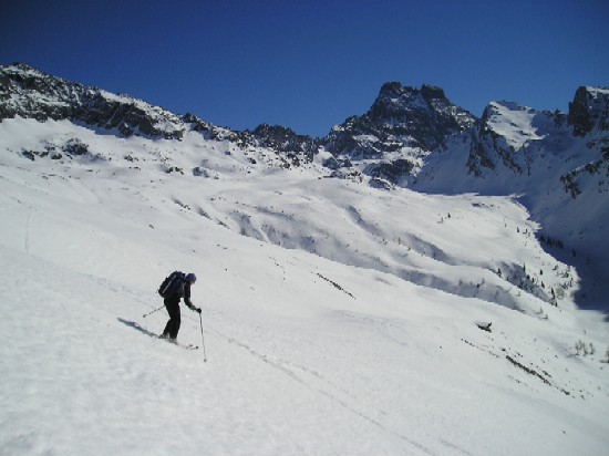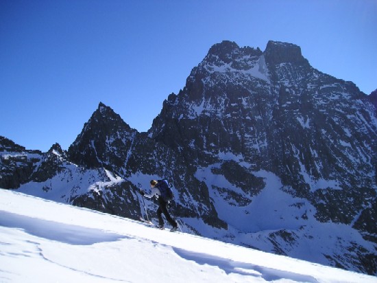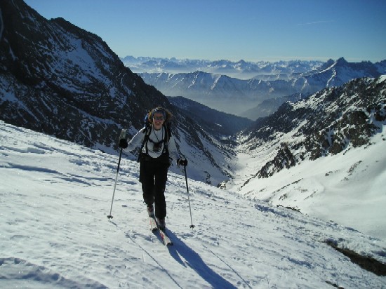 Superbe journée avec une vue panoramique sur le viso. La descente de la pointe Joanne, béton sur le haut nous a réservé une belle surprise (bonne vieille poudre) dans la dernière pente pour rejoindre le vallon. La descente du Sellar en transfo à point (mais uniquement dans les contrepentes vraiment Sud)reste la plus belle descente en qualité de ski ce raid