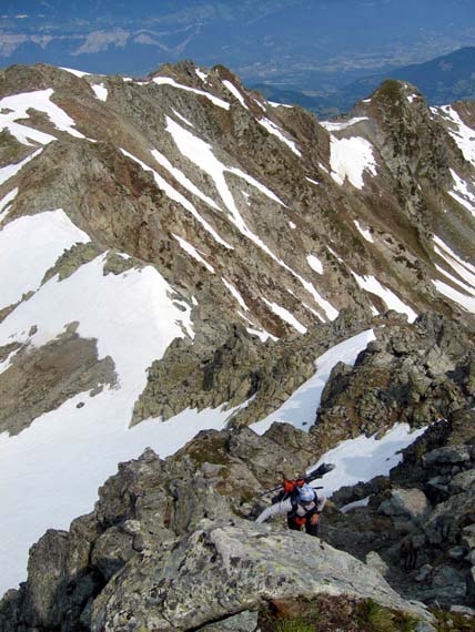 Une qualité de neige parfaite dans toutes les descentes et montées sur un circuit où nous avons privilégié les aretes rocheuses dans les montées. Tout ceci grâce à une température assez basse. Une belle façon de raccrocher (sans doute ?) dans belledonne qui reste probablement le massif le moins mal enneigé de cette saison un peu curieuse avec une limite de ski en sud pas tellement inférieure à celle des versants nord . Il n'a pas manqué grand'chose pour réaliser le hold-up parfait initialement envisagé, consistant à descendre de la Jasse sur le Vénétier avant de remonter à la dent du Pra. Et pour tout dire, j'ai deja connu des 14 juillet plus copieux que ce debut juin.