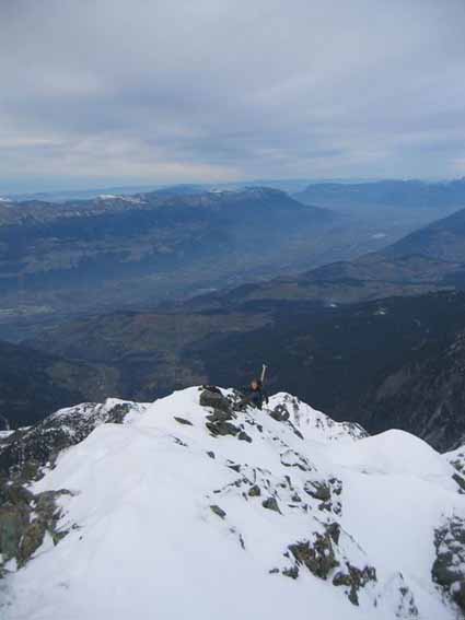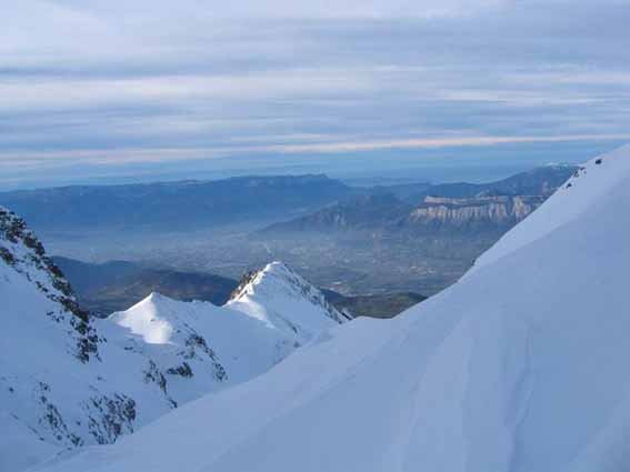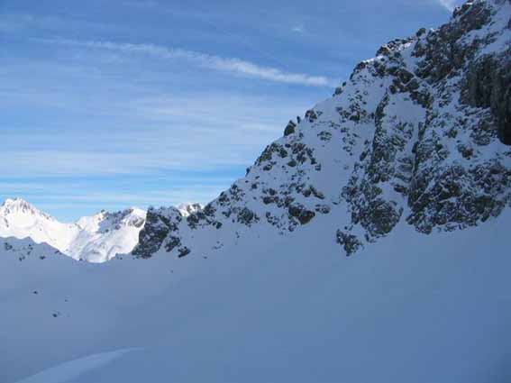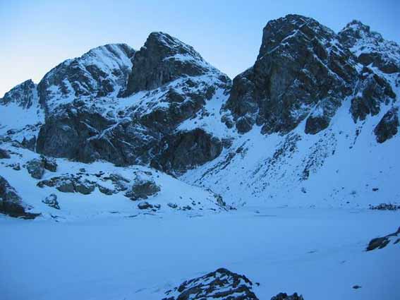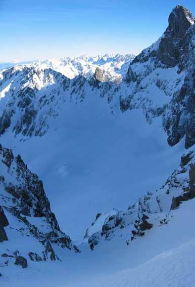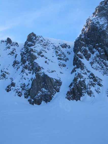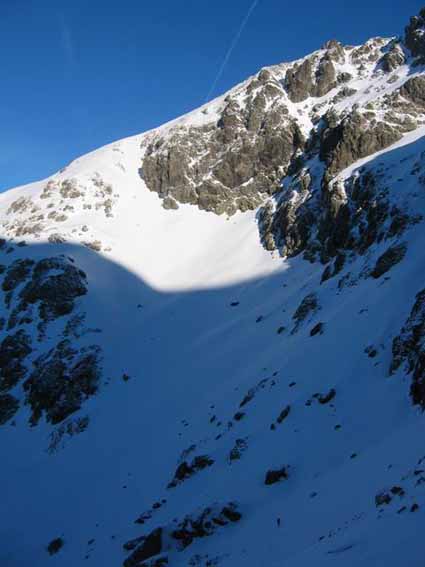 Nous avons préféré remonté le couloir N des Rochers Rouges que de le tenter à vue. La croute glacée cachée sous quelques centimetres ne nous a donc pas pris par surprise même si nous n'avons pas pu éviter le dérapage sur les 30 metres terminaux.