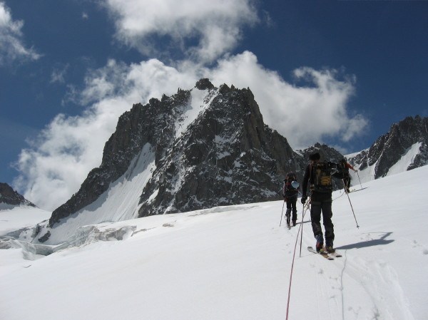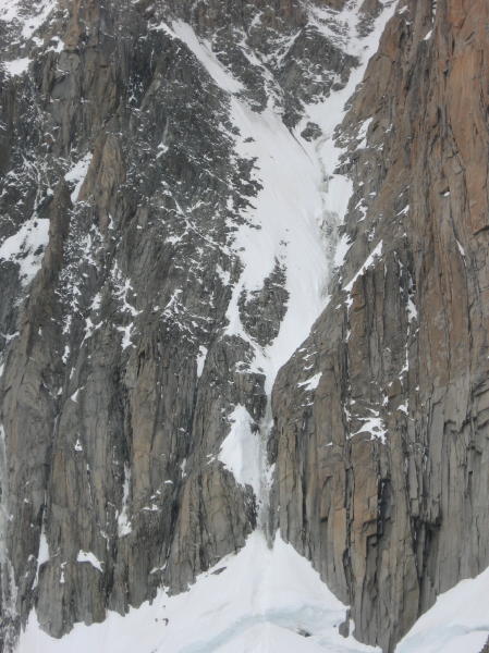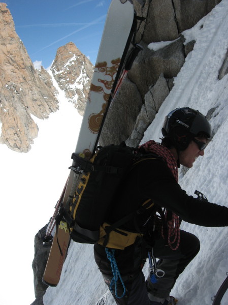 Première journée dans le secteur qui nous a permis de repérer les faces E du tacul tout en faisant un joli petit couloir en conditions extra (si ce n'est la sortie mixte non skiée). L'iso est remonté très haut ce jour avec peu de regel et ce fut un festival de purges torrentielles dans les versants E à S , ravageant toutes les pentes raides de ces orientations (diable, jager, col du diable etc.). Les pentes N sont égalemnent goulottées et transfo jusqu'à 4200m au moins. La seule pente encore jouable était le Gervasutti du tacul dont on fait notre objectif du lendemain: avec néanmoins une rimaye monstrueuse à passer en rappel (20m?)