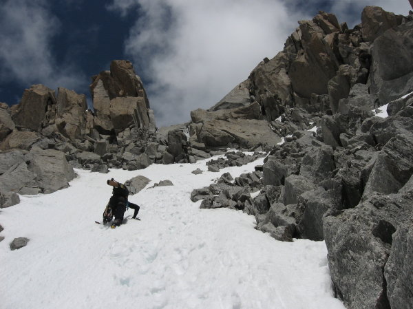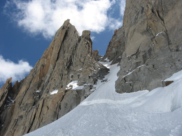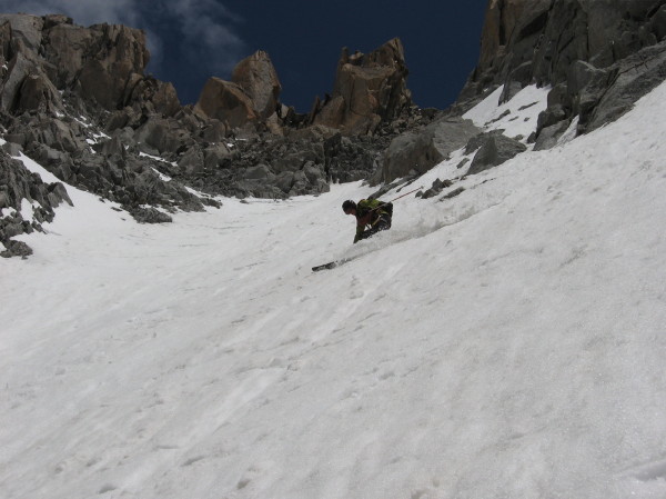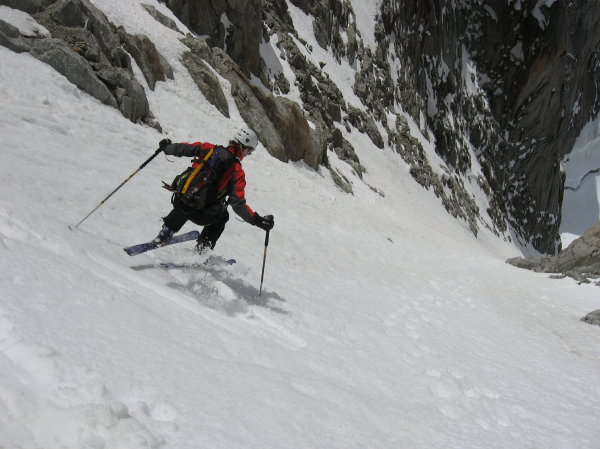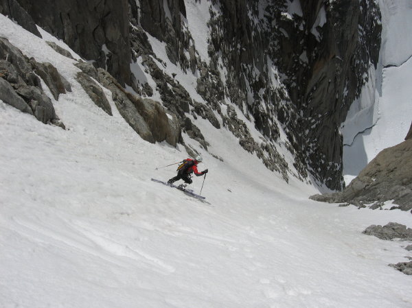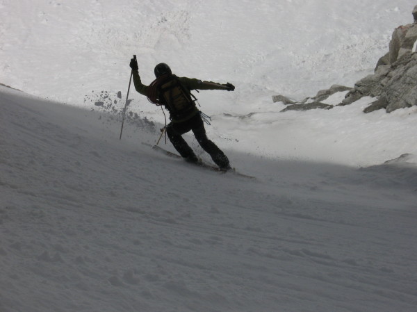 Dans le couloir, en raison du faible regel il ne fallait pas attendre trop de décaillage au risque d'avoir une croûte cassante sur fond pourri. Le meilleur ski était Rive gauche, à peine décaillée mais avec un très bon grip. Chutes de pierres dès que le soleil atteint le couloir. Les 30 derniers m étaient inskiables et ces chutes de pierres nous ont incité à chausser là sans sortir sur l'arete. Rimaye passe bien à la montée Rive droite, et avec un petit saut (1.5m) dans l'axe à la descente. Ponts de neiges fragiles sur le ressaut du glacier.