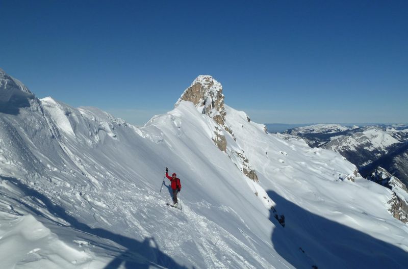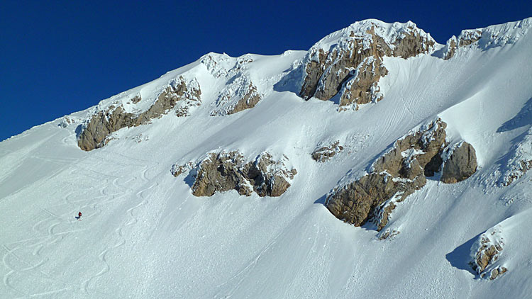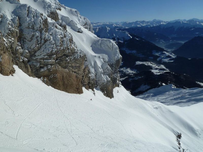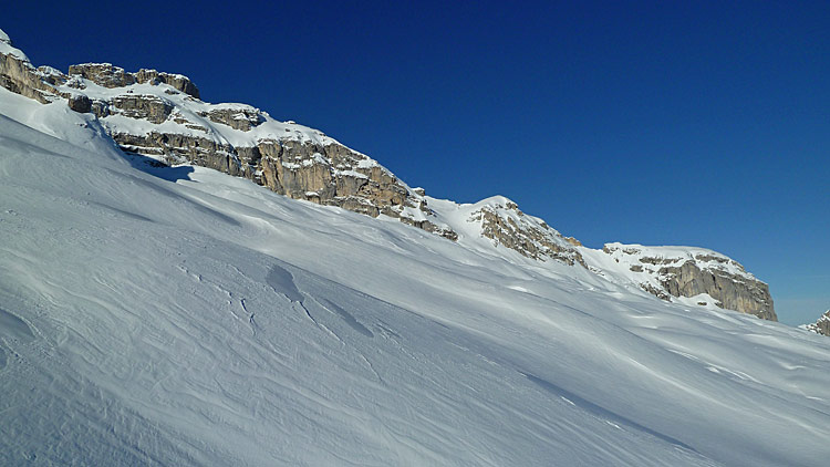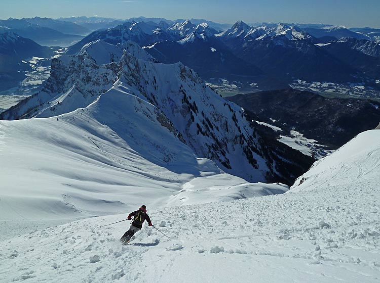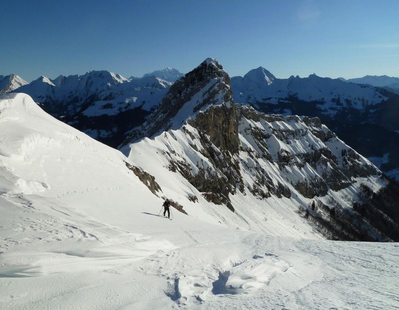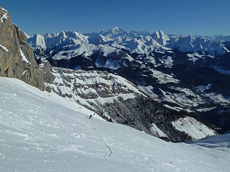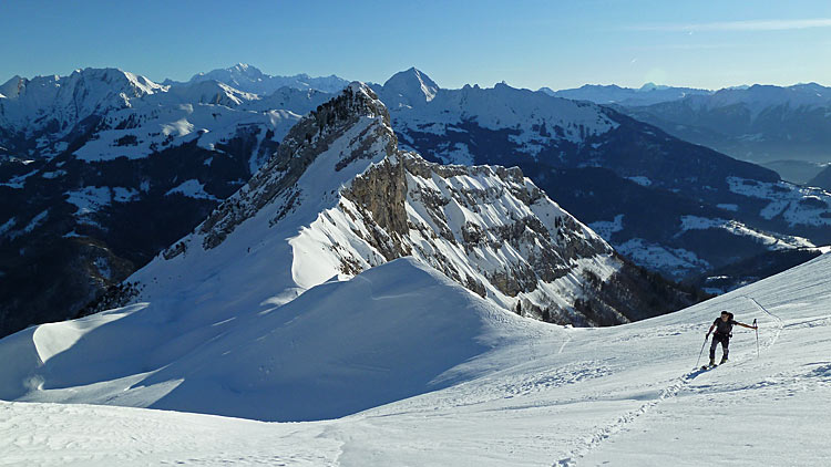 Un tour en très bonnes conditions, les skis larges facilitant à coup sûr la descente dans ces neiges assez variées faites de croûte plus ou moins revenue, voire d'un peu de soupe plus bas.