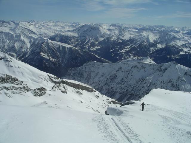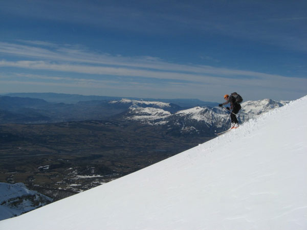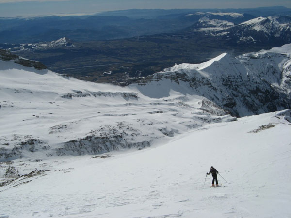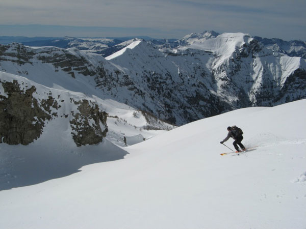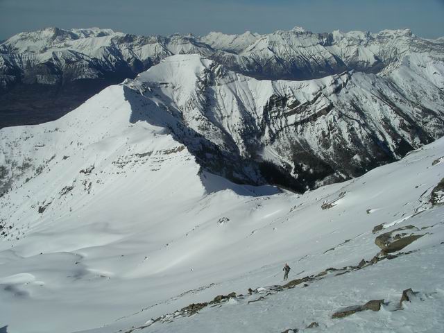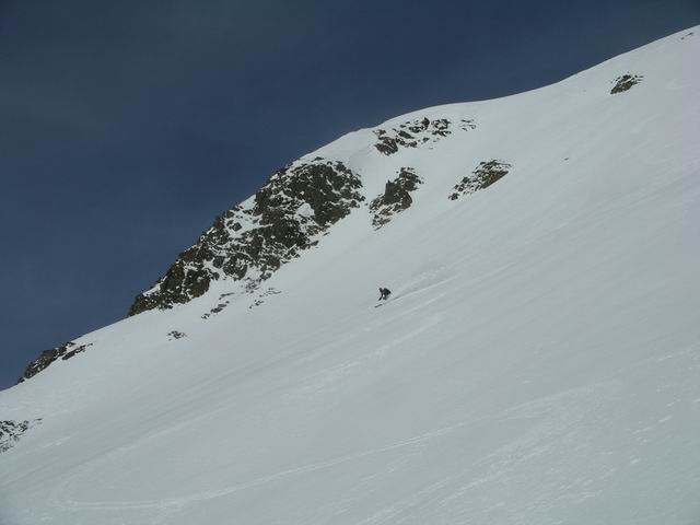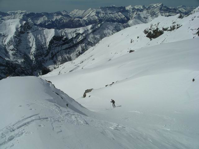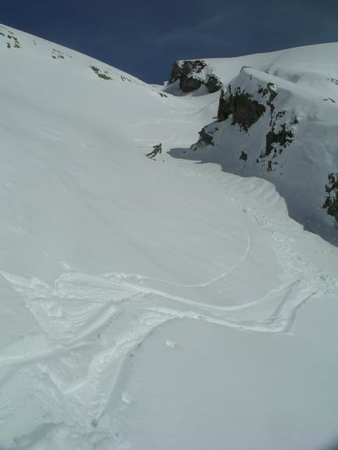 L'idée première était de rejoindre F8 en traversant le Tourond de Sud-ouest en Est. Une fois au sommet, les énormes accumulations et les départs de plaques observées sous la crête Tourond-Vénasque nous en ont vite dissuadé, d'autant qu'il en restait encore à partir. Finalement cet aller/retour, d'ailleurs en excellentes conditions, nous a permis d'arriver au Vieux Chaillol après la foule puisque nous avions le sommet pour nous seuls. Déscente excellentissime, avec les halps-pipes bien gavés, que quasi personne n'emprunte d'ailleurs. Réalisée dans de telles conditions, cette classique mérite vraiment le déplacement.