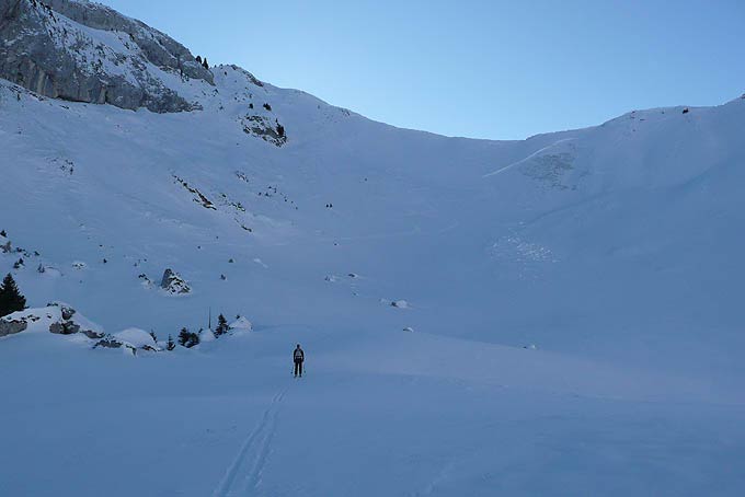 On le savait, la qualité de neige n'est pas terrible en toutes observations. C'est pour cela qu'on a profité de faire un beau voyage plutôt que de faire du mauvais ski. Une plaque partie dans la nord de Bellefond (vue déjà depuis le Granier il y a 8 jours). L'isotherme 0°C à plus de 3000 m a bien tassé les choses et on trouve du grain fin dans les versants nord d'altitude. Peu de neige mobilisable en général, sauf piège bien caché évidemment. Descentes bien cassantes pour les cuisses.