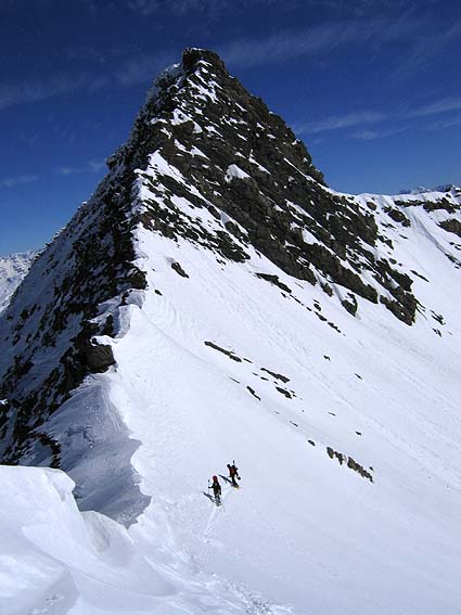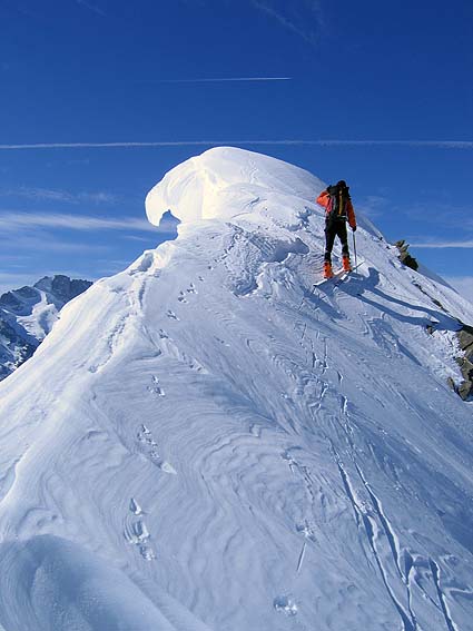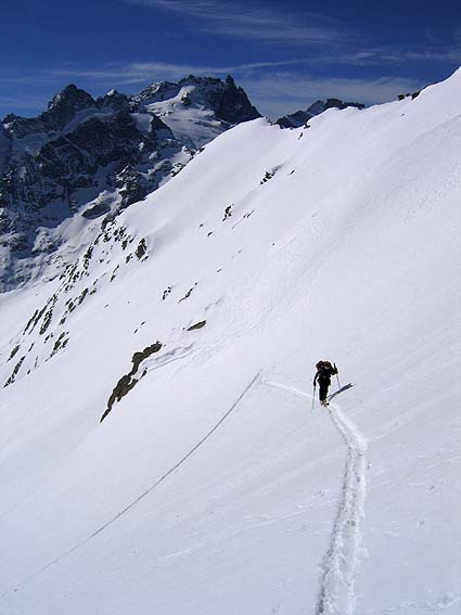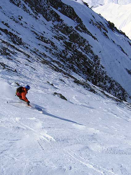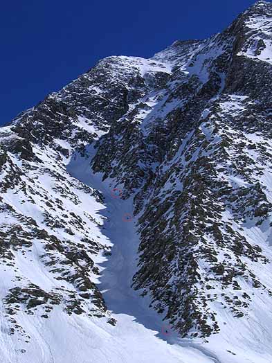 Très haut couloir jamais très raide mais comportant une courte section à 50° dans le haut et une exposition certaine compte-tenu de son caractère tournant. L'option du à-vue est payant pour soulager les mollets. Assurément un des plus beaux couloirs des Arves avec son voisin versant NE de l'aiguille Argentière (tiens tiens un enchaînement logique d'hiver au départ de Bonnenuit...)