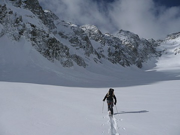c' était pas gagné:à 5h30 au parking,il neige,nous nous rendormons 1h. ensuite,il y a une grosse trace à faire qui ressemble parfois à "une tranchée" assez fatigant bien que nous soyons 3 pour nous relayer! De plus, bien que tout le cône ait purgé naturellement sous forme de plaques, il reste de grosses quantités de neige,qui nous obligera à nous méfier,tester régulièrement la neige.