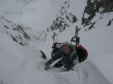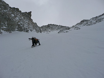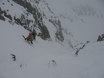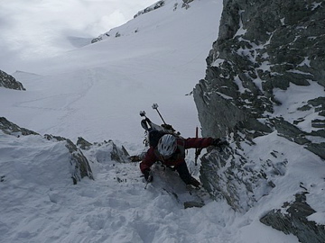 pour la descente: l' écharpe découverte par LAL lors de son passage en 2005 est le meilleur plan(bien visible à la montée main droite,située plus bas que le ressaut d' attaque du couloir):c' est en neige,quelques pierres par endroit,mais passe sans aucun soucis.