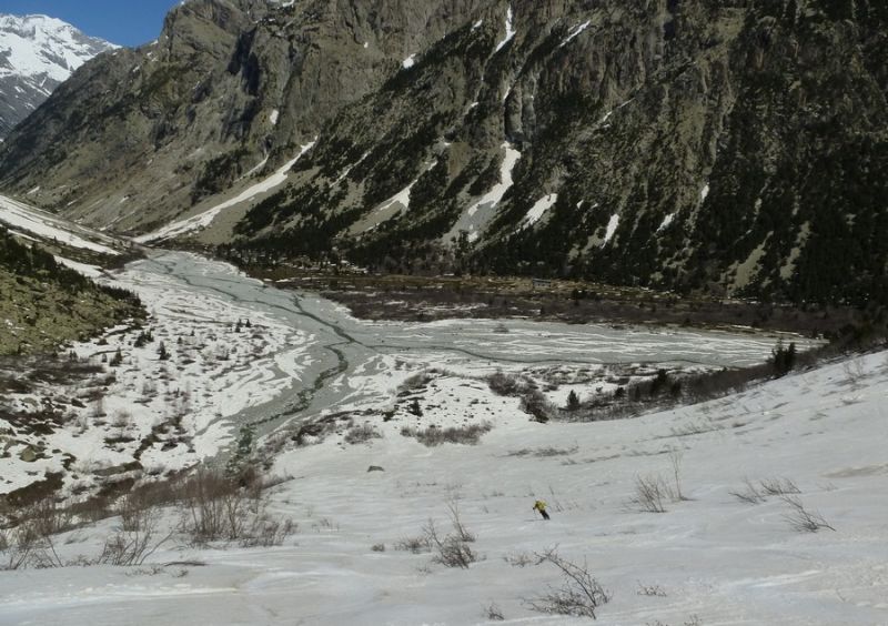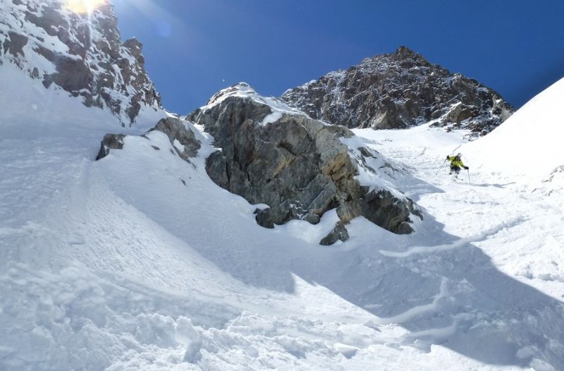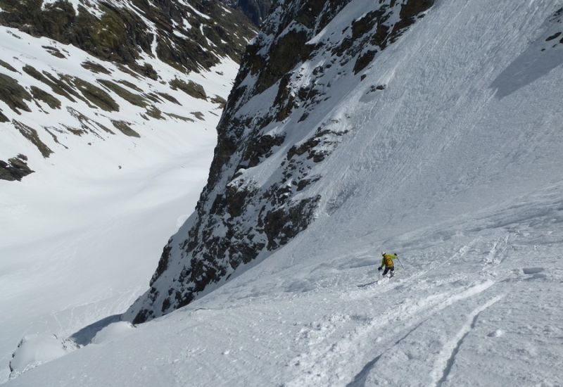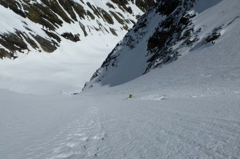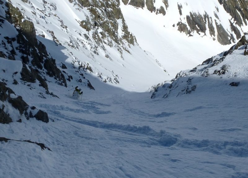 On trouve la neige après le Carrelet juste à l'entrée du vallon du Chardon. Dans le couloir, montée et descente par la goulotte rive droite. Une contre pente très skiante permet d'éviter son axe à la descente. Chaussage 20 mètre sous la sortie pour éviter une zone un peu glacée avec du relief tout en haut.