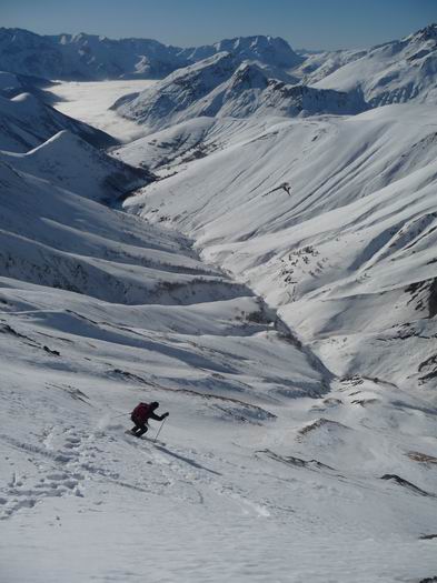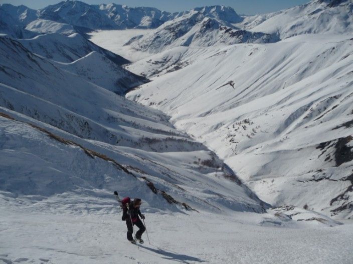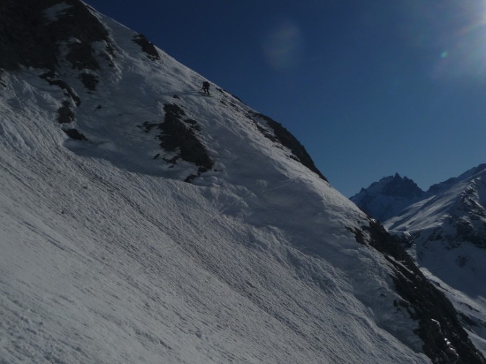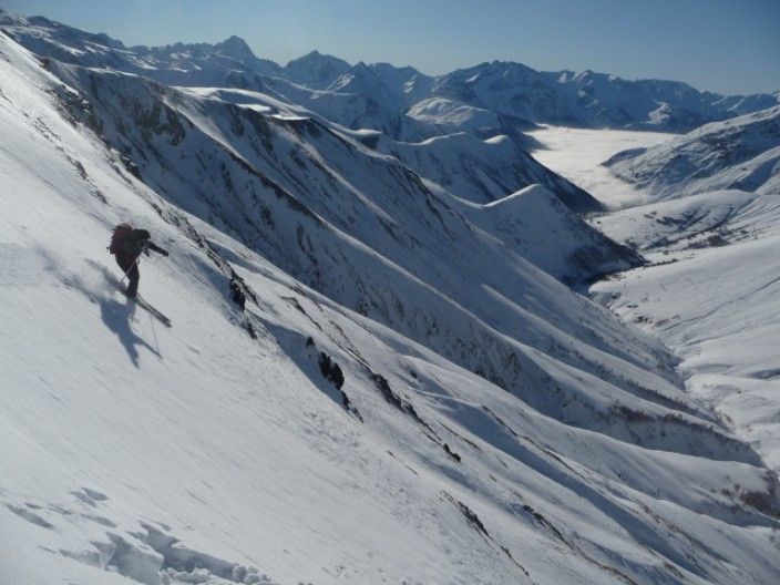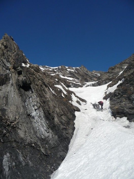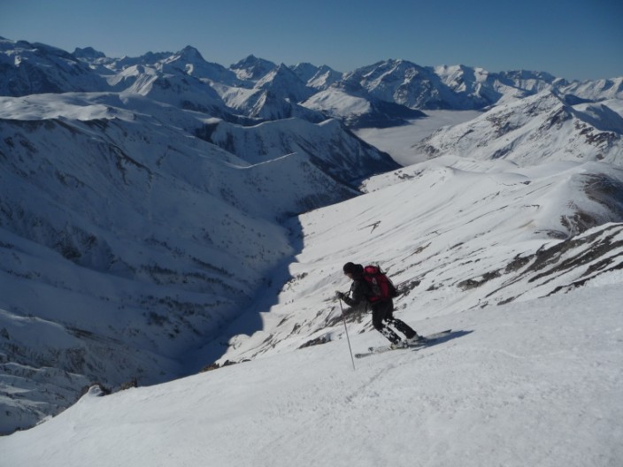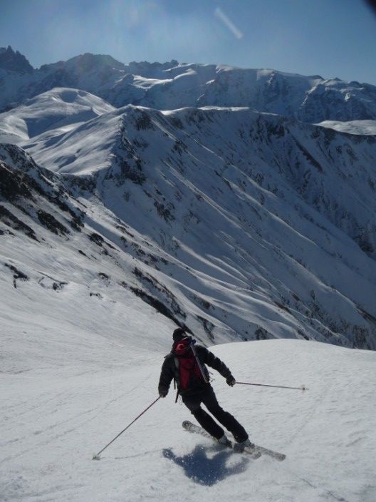 Après un faux départ pour oubli de bâton (merci le bar à Besse !) c'est partit. Du sauvage oui, personne dans le coin ! De l'exotisme aussi en changeant de massif assez peu fréquenté. De l'aventure et du piment, aussi dans le couloir de la grande crevasse. On a finit en A/R par l'Or de Maringue qui était proposé dans le topo de Michel Armand (repris dans le ART), superbe aussi. Quand la la Grande crevasse, c'est jamais très raide, mais le cheminement est difficile à vu et l'expo bien présente ! Pas évident d'avoir de bonnes conditions dans ce bordel avec les lauzes, trop rempli=dangereux, trop revenu=plein de caillasses (un peu comme les aiguillettes de Vaujany ?). Ce jour les conditions étaient bonnes et c'est une belle aventure, merci le topo ART ! 1850m de dénivelé pour 2x700m de très belle pente...j'ai adoré.