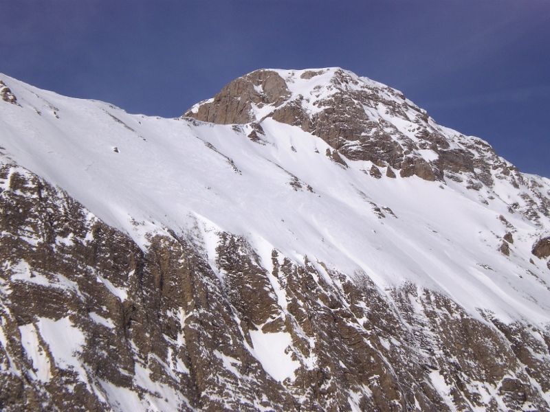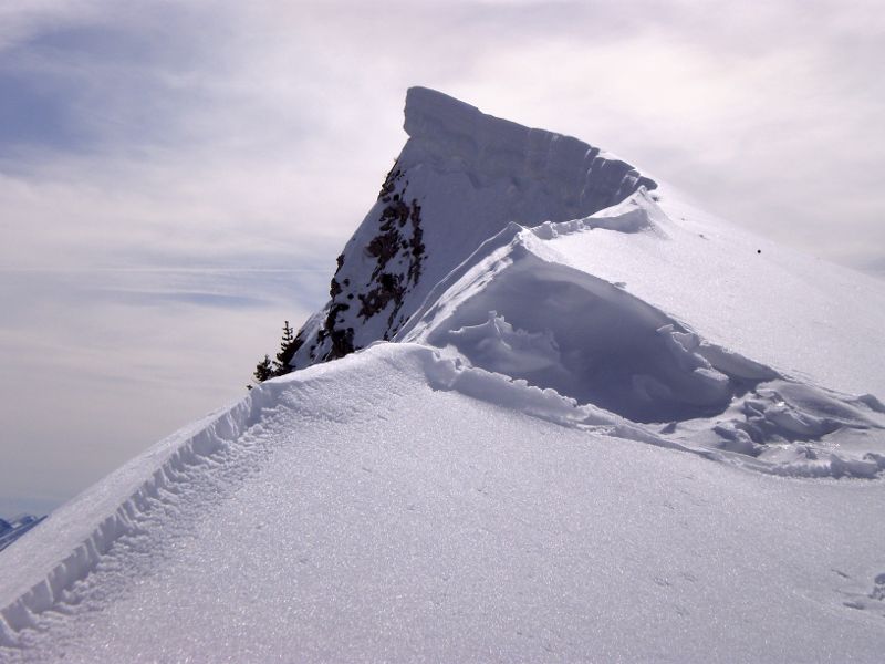 J'ai fait une coupe dans la pente qui se redresse sous la crête (environ 25°) : 20 cm de grains fins liés dont surface dure qui glissent facilement sur une autre couche de grains fins moins liés (plaque friable), le tout sur vieille couche de regel sans aucune adhérence. Vers le fond, on trouve beaucoup de grains ronds en fusion. Bilan, gaffe !
