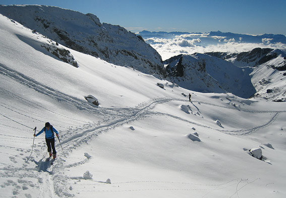 rocheberanger->croix>robert->van. retour par col de la Botte. la pente d'accès à la combe des Van au-dessus du col des Lessines n'est skiable que dans les traces damées Skis cailloux recommandés. Nulle part on ne peut vraiment se lâcher.