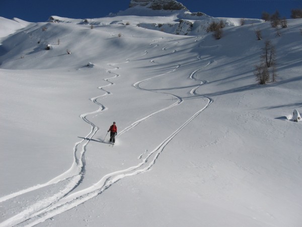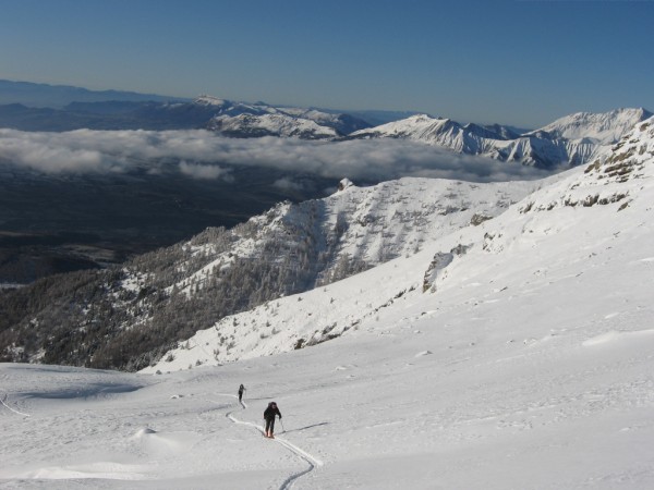 Globalement du bon ski dans les zones non cartonnées par le vent de nord de samedi, facilement repérables à l'oeil. Bon enneigement sur ce secteur où l'on peut skier sans se méfier des cailloux jusqu'à 2000m environ. 40 de fraiche en cours de tassement sur une croute de regel qui épargne bien les semelles.En dessous avec des vieux skis nous avons rejoint la station sans déchausser et sans faire un carnage sur les semelles...moyennant quelques passages acrobatiques et conversions sur les dalles rocheuses.